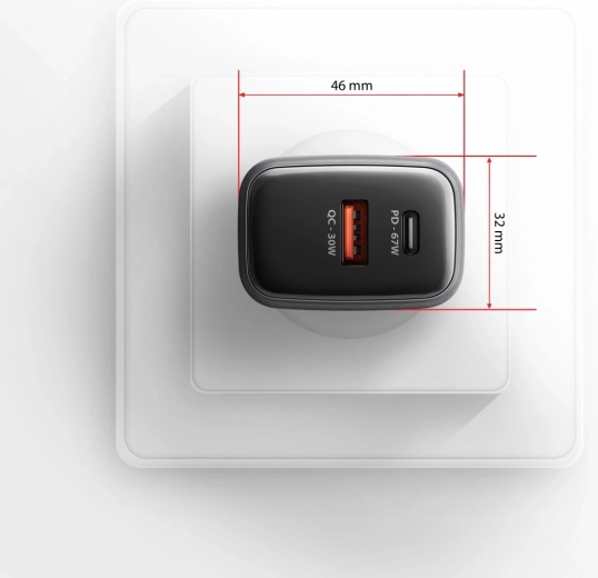 A powerful wall charger with the latest GaN technology offers high efficiency in a compact body. The USB‑C PD 3.0 (up to 67 W) port is ideal for modern laptops, tablets, and smartphones, while USB‑A QC 3.0/4+ delivers lightning‑fast charging for compatible phones. PPS support ensures optimal performance even for more demanding devices.