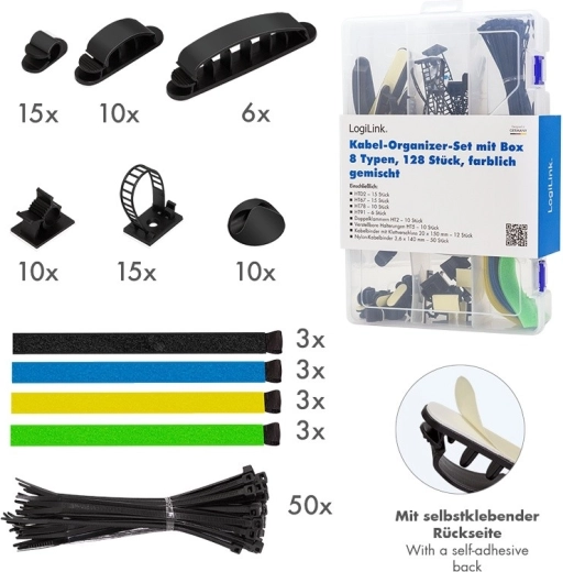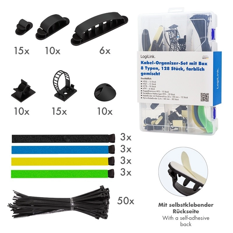 Tidy up your cables quickly and effortlessly. This universal set from LogiLink helps route and secure cables around your desk, TV setup, and workshop. Thanks to the transparent box, everything is neatly at hand and ready to use.