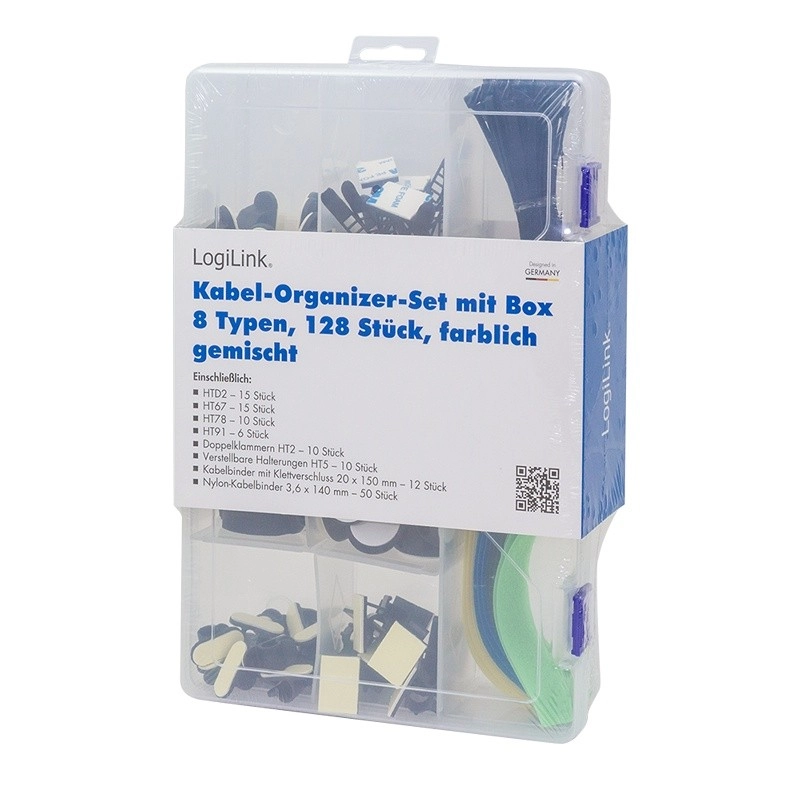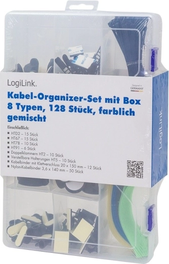 A practical LogiLink set for tidy cabling at home and in the office. It includes 8 different componentscable ties, clips and cable holders — stored in a transparent transport box for easy carrying and storage.