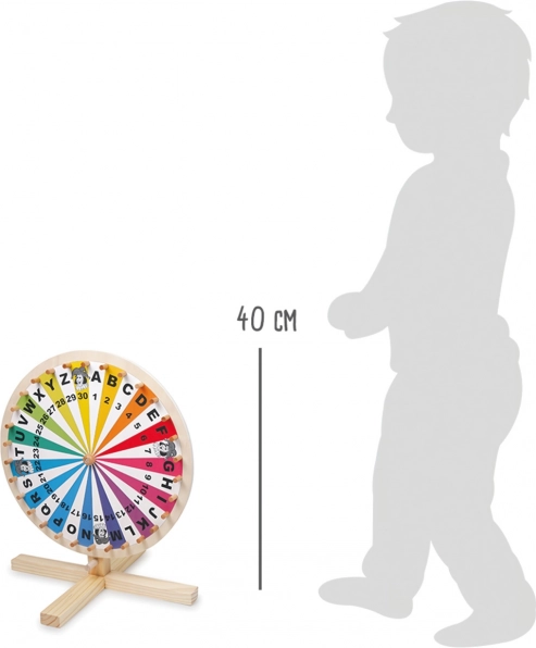 The small foot wooden wheel of fortune turns every activity into an exciting game. Thanks to segments with letters A–Z, numbers 1–30, and four wildcards, it’s perfect for word games, raffles, educational activities, and family competitions. The colorful design supports orientation and keeps children engaged.