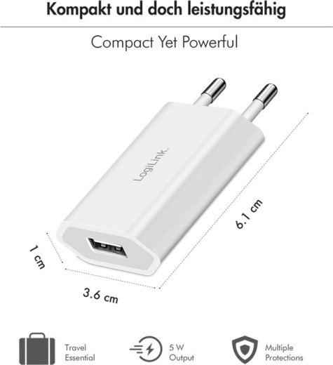 The lightweight, minimalist LOGILINK adapter with a single USB-A port fits any outlet and is perfect for travel and home use.