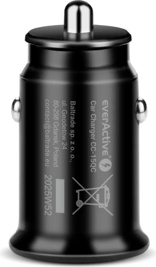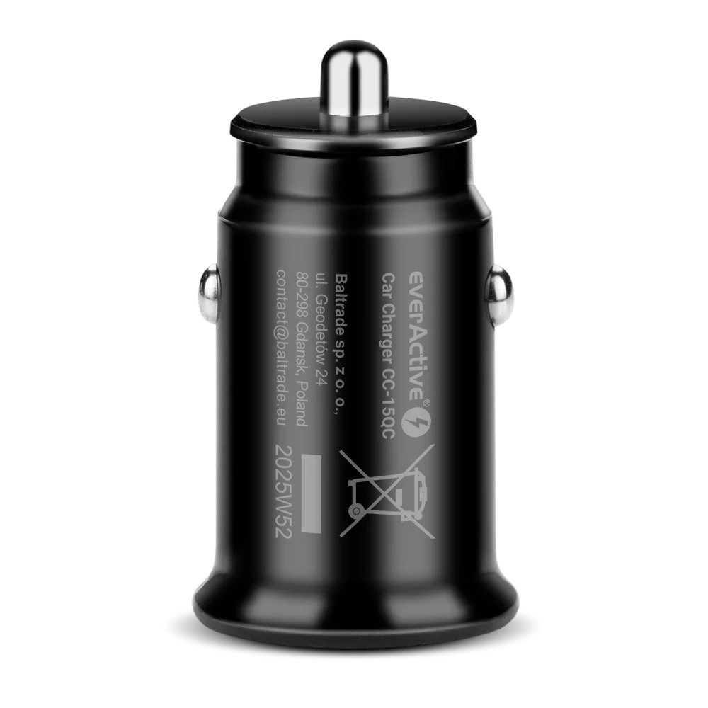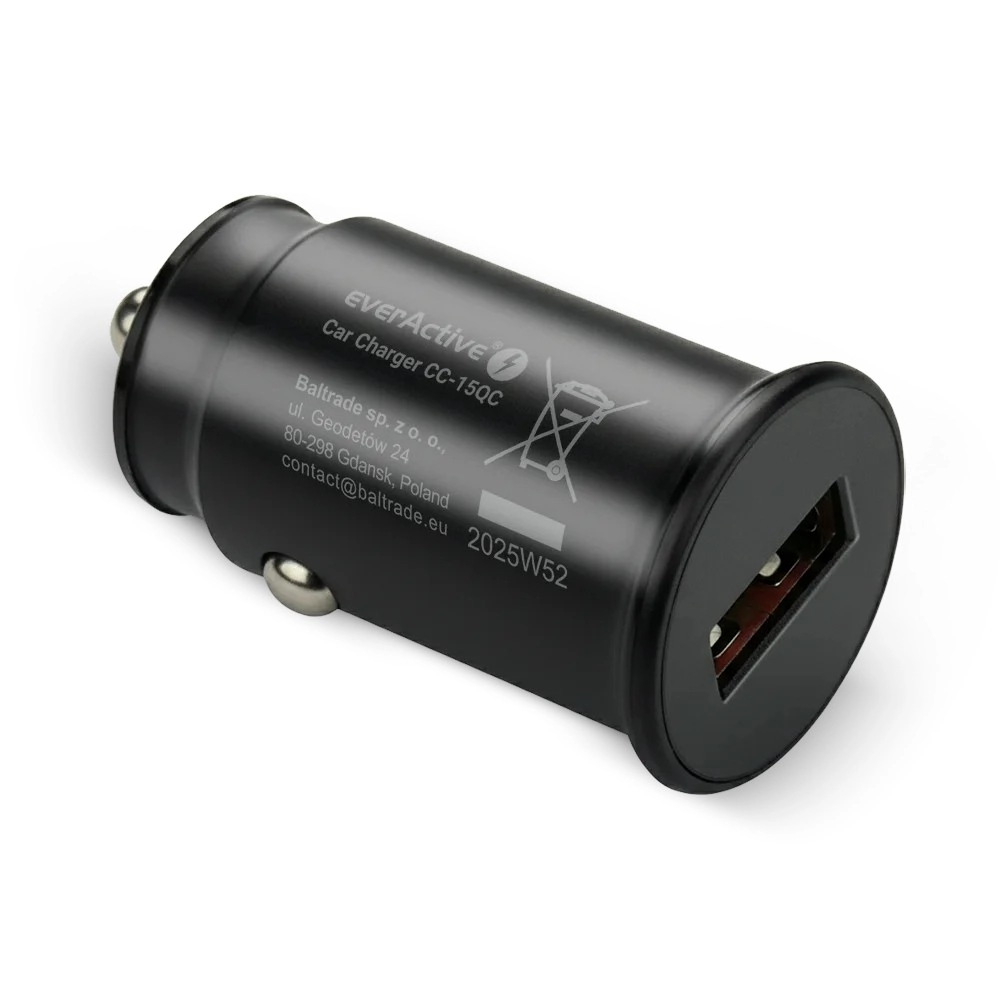 Compact everActive car charger with one USB‑A port and Quick Charge 3.0 delivers fast, stable charging up to 18 W. Thanks to its wide compatibility, smart electronics automatically adapt to your phone, navigation system, and other mobile devices—ideal for any trip.