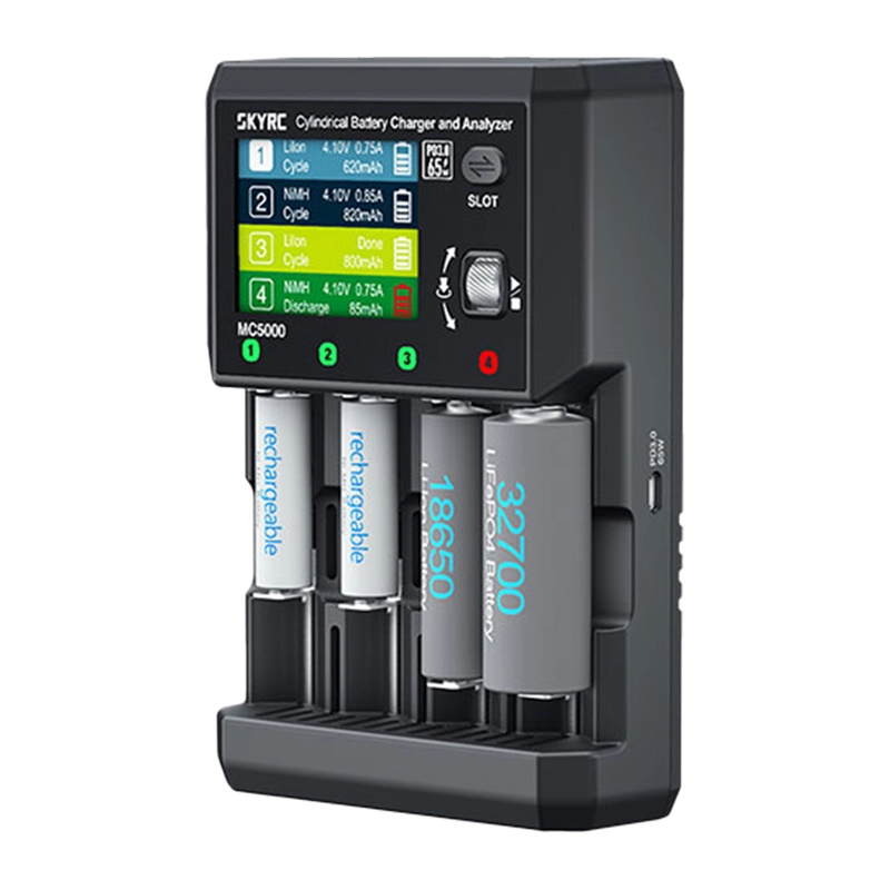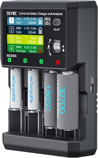 The SkyRC MC5000 combines a charger, analyzer, and tester in one compact device. Each of the four channels works independently, so you can handle different cell types and sizes simultaneously and tailor the charge/discharge current to each battery. The large 240×320 px LCD shows voltage, current, capacity, and time, while Bluetooth connectivity enables convenient monitoring and management via the mobile app.