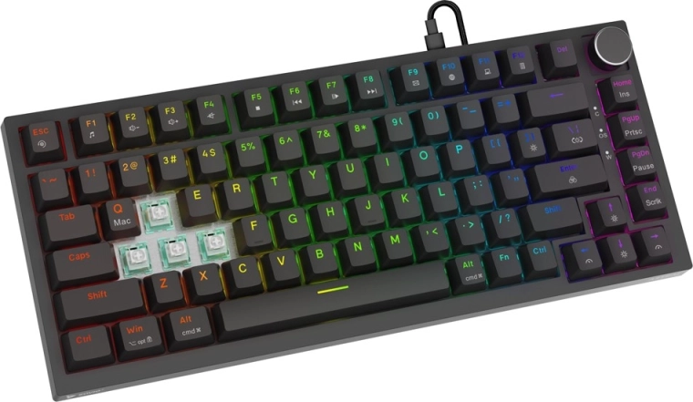 The compact 82-key layout saves mouse space without losing key functions. With full N-key rollover and anti-ghosting, every press registers exactly as intended—even in the fastest combos. Programmable RGB lets you create effects, profiles, and macros in software, while PBT keycaps resist wear and prevent slipping.