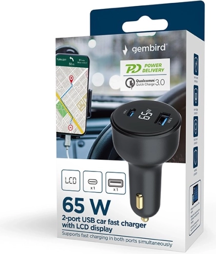A powerful car charger with a total output of 65 W quickly charges a laptop, smartphone, and iPhone via USB‑C. It offers 2× USB‑A + USB‑C (Power Delivery), fast charging on both ports, and a handy LCD display showing charging status. Integrated smart protections guard against overload, overvoltage, and short circuit.