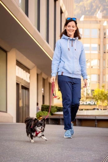 The breathable Air-Mesh fabric is soft, padded, and provides a cooling effect in the heat—simply soak the harness in cold water before a walk. Reflective elements increase visibility in the dark, and freedom of movement is enhanced by elastic seams that adapt to the dog’s body. With the hook-and-loop fastener, you can easily fine-tune the size, and the padded buckle protects the coat from snagging.