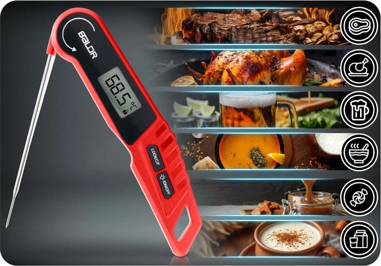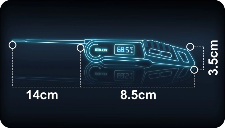 Achieve perfectly cooked dishes without guesswork. The BALDR BD-130 is a digital food thermometer with a 14 cm stainless steel probe and 180° foldable design, ensuring safe and comfortable temperature measurement for meats, roasts, baked goods, and beverages. With a 2–3 s response time and ±1 °C accuracy, you’ll have confidence in the correct temperature when cooking, baking, or grilling.