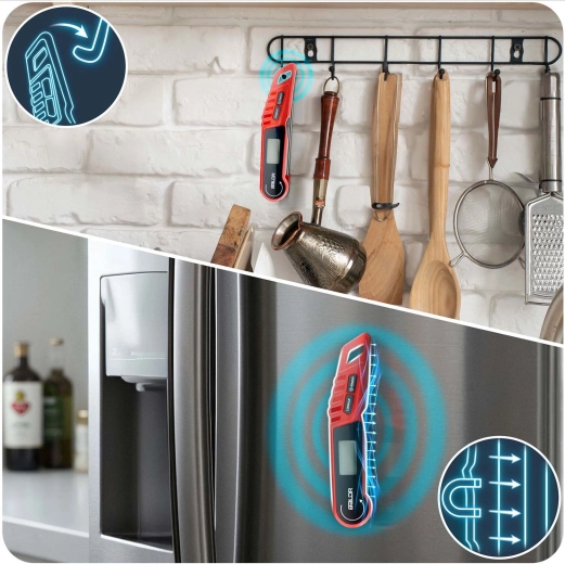Practical features such as a backlit LCD, automatic rotation of the display, °C/°F unit switching, and LOCK for holding the reading make it easy to use in any conditions. IPX6 water resistance allows rinsing under running water, and the integrated magnet plus hanging loop ensure the thermometer is always within reach—on the fridge, oven, or grill.