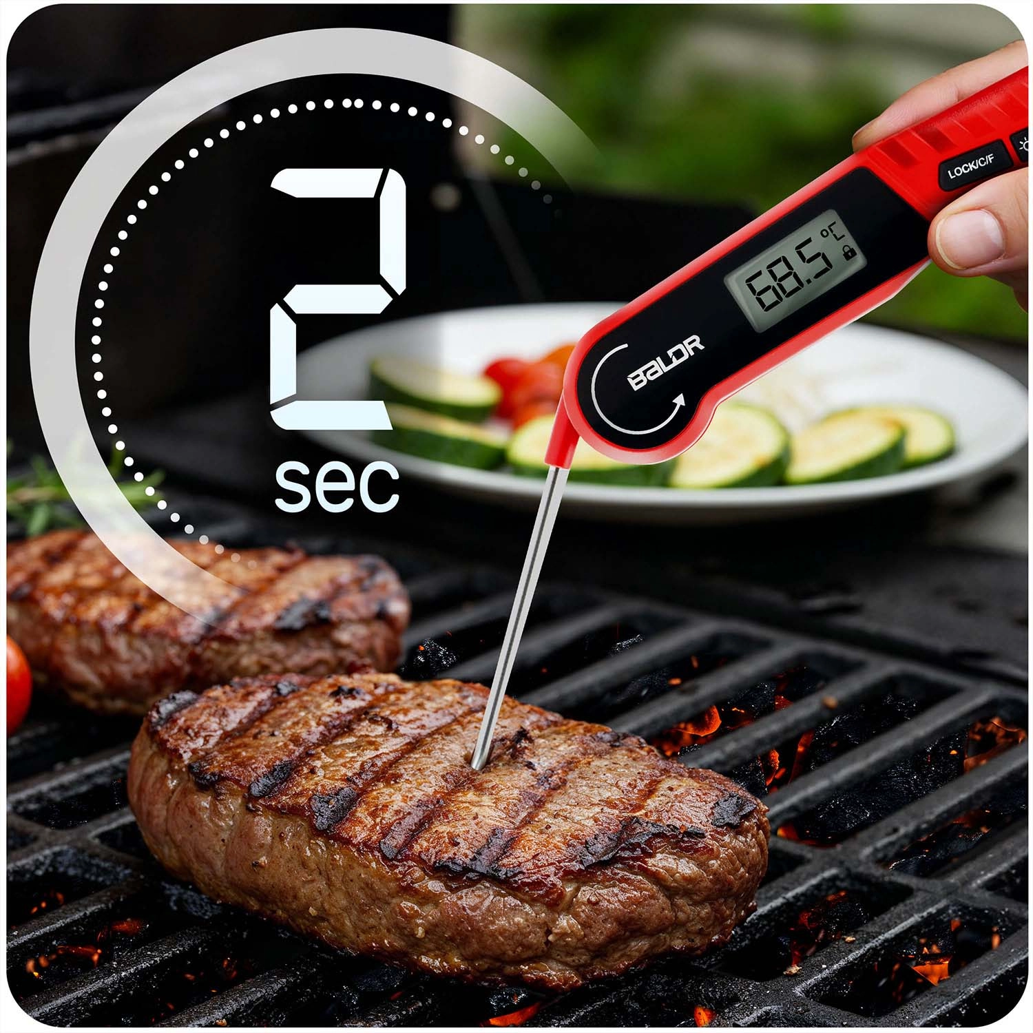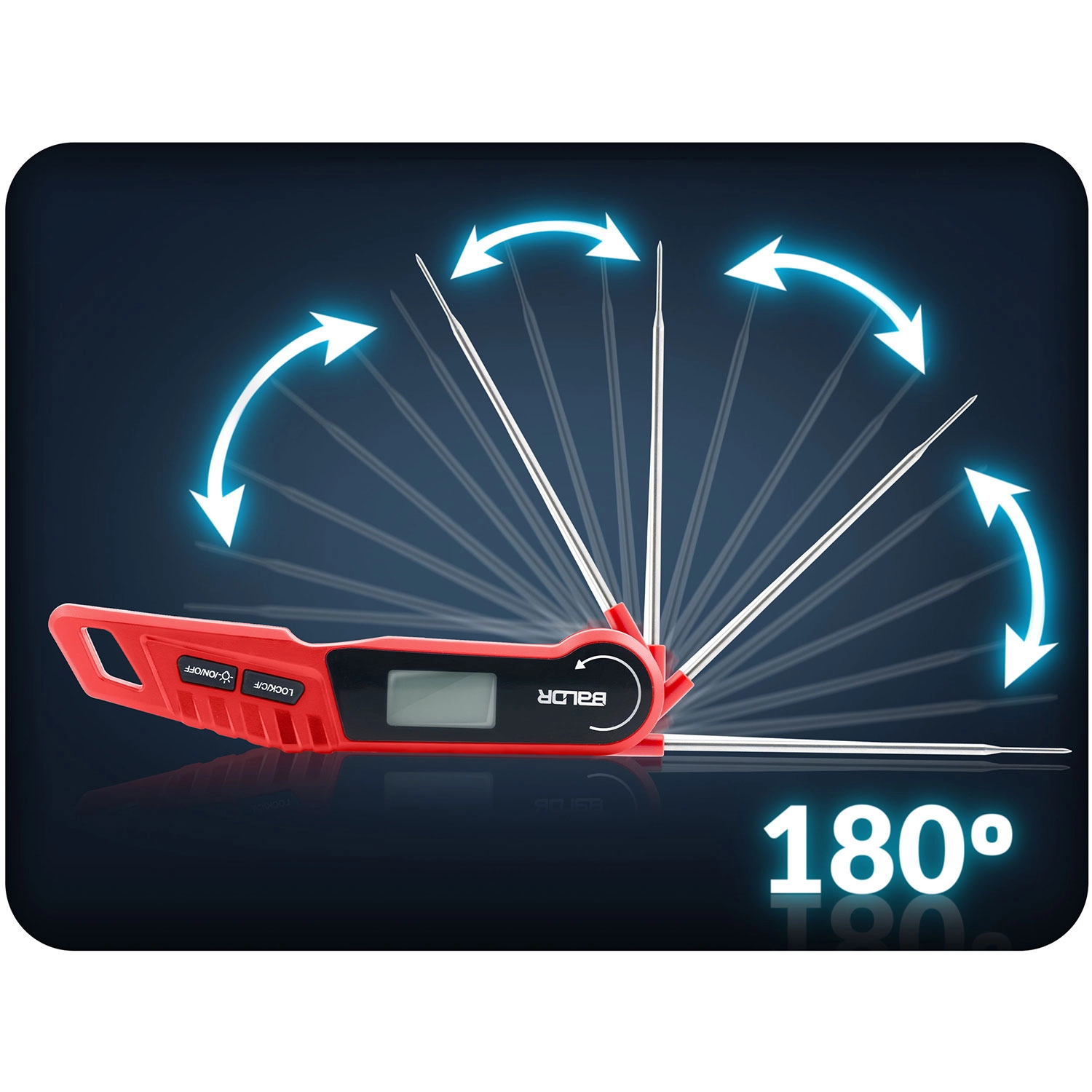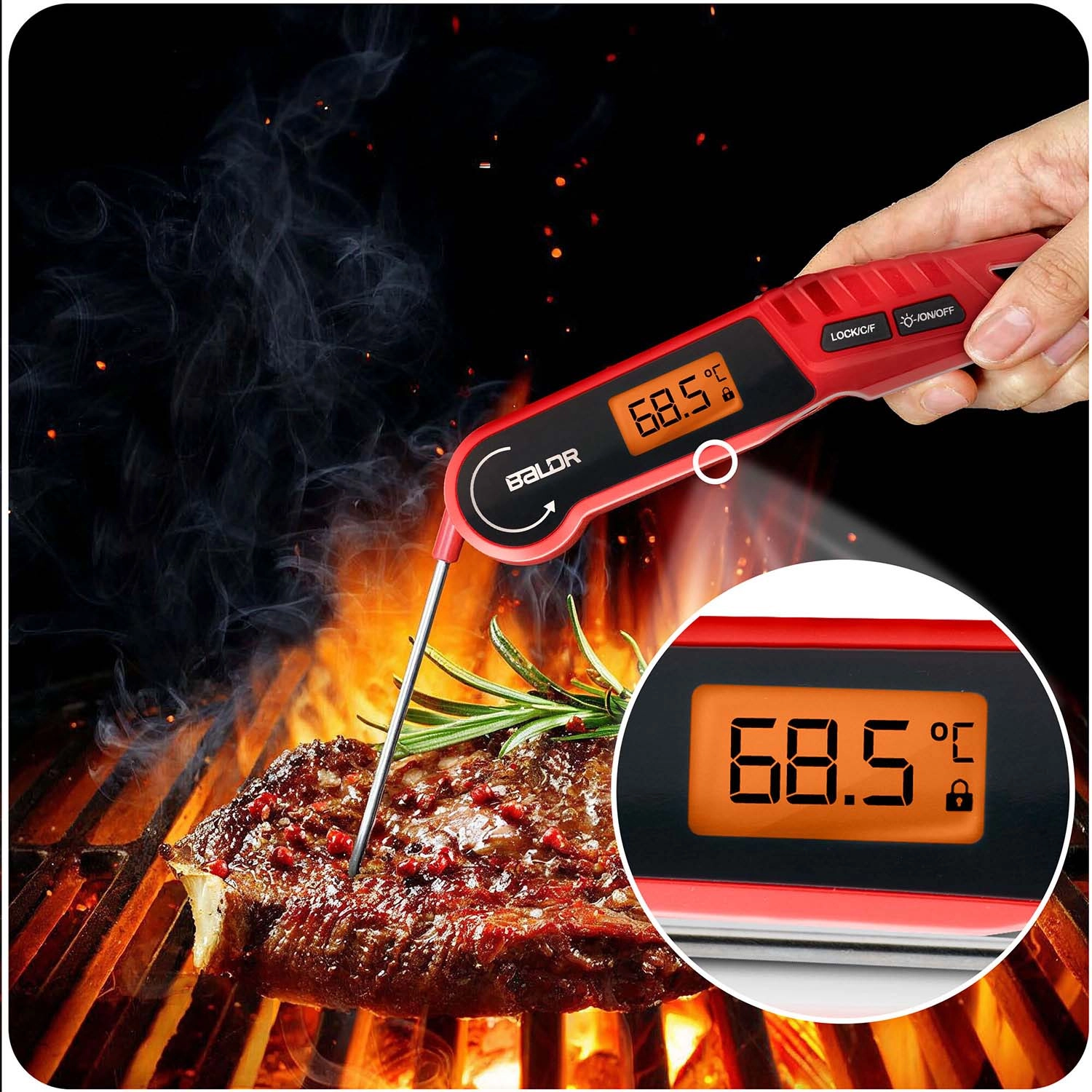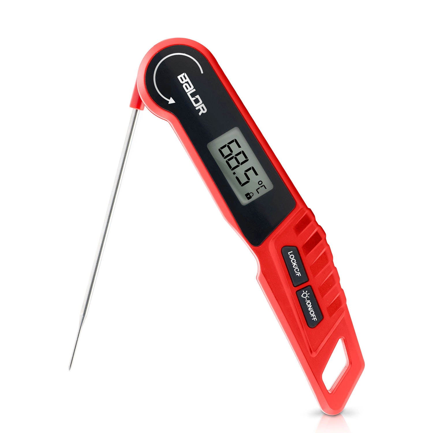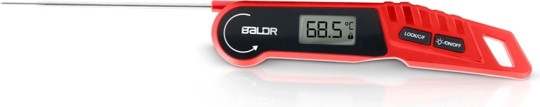 The fast and accurate BALDR BD-130 kitchen thermometer with a foldable steel probe measures temperatures from -50 °C to 300 °C within 2–3 seconds with an accuracy of ±1 °C. It features a backlit LCD, auto-rotating display, °C/°F switching, LOCK function, IPX6 water resistance, and a strong magnet for easy attachment to metal surfaces—ideal for the kitchen and the grill.