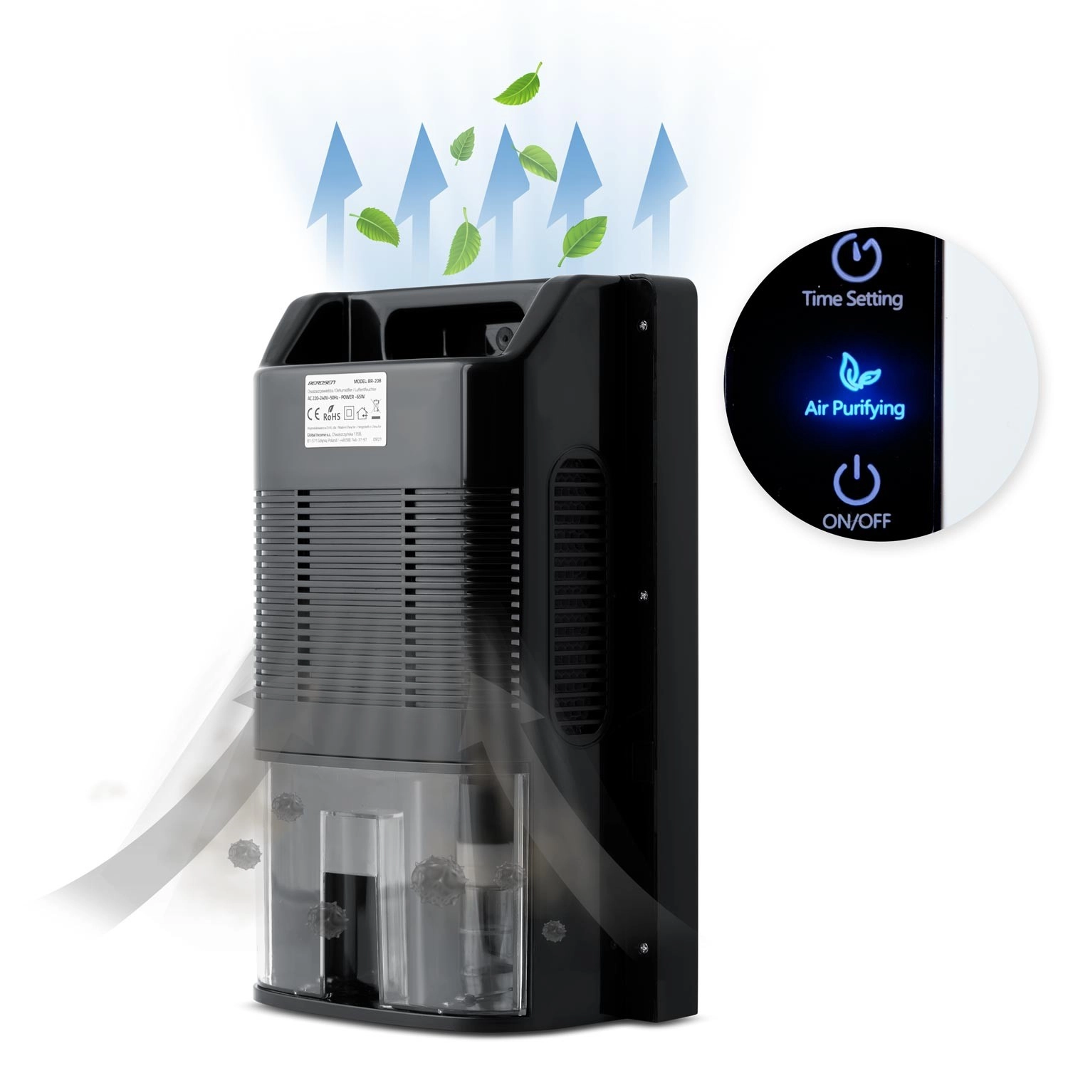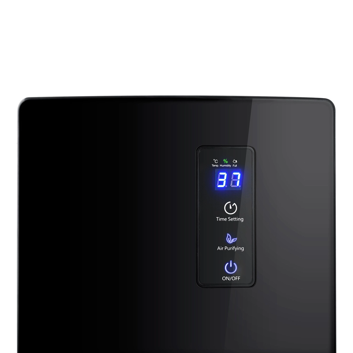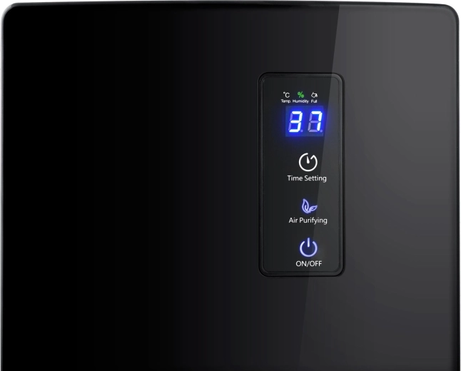 The thermoelectric Peltier technology reliably condenses moisture without chemicals. The clear touch LED panel displays all key information, and the 1–24 h timer makes scheduling easy. A water level detector automatically switches the device off when the 2 L tank is full and alerts you by changing the indicator color.