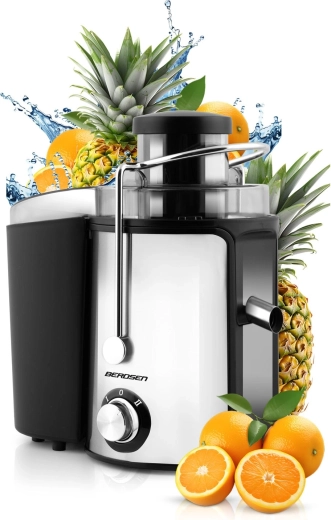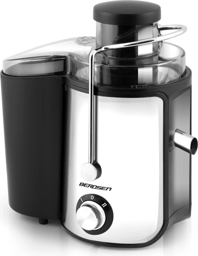 Make fresh, vitamin-packed juices at home with the BERDSEN BD-750 juicer. It offers two speeds for fruits and vegetables, a powerful and energy-efficient motor, a stainless-steel and black finish for an elegant look, non-slip feet for stability, and easy cleaning with dishwasher-safe parts. Safe operation is ensured by a misassembly lock and overheat protection.
