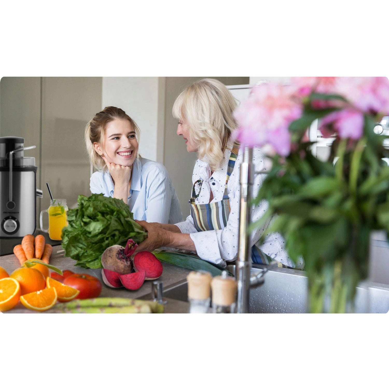 Selected parts are dishwasher-safe. The 0.5 L juice jug and 1.4 L pulp container make everyday use simple.
