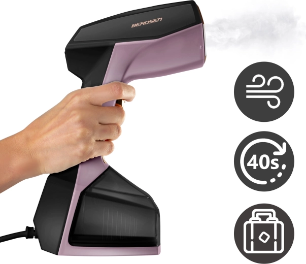 The powerful BERDSEN handheld garment steamer with 2000 W delivers a strong steam output of 45 g/min, 10-second heat-up, and a large 360 ml removable tank. It offers 3 steam levels, one-button control, an LCD display, and included accessories. Ideal for quick crease removal, chemical-free steam sanitization, and refreshing garments and home textiles.