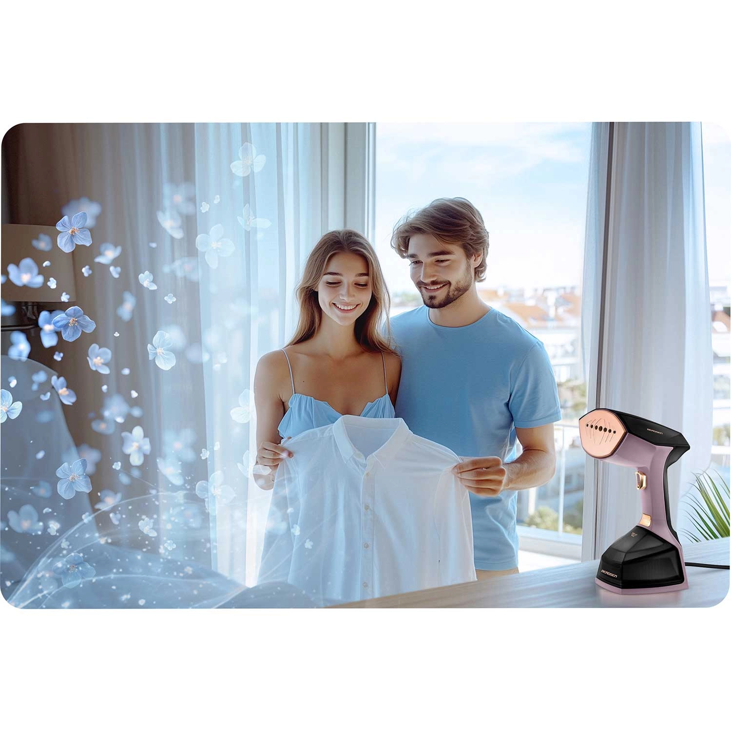 The BERDSEN BD-300 is a compact and stylish steamer that quickly and gently smooths creases on clothing, curtains, and upholstery—no ironing board needed. Thanks to 2000 W and a flow of 45 g/min, steam penetrates deep into fibers, removes odors, and helps reduce bacteria and dust mites. The LCD display makes it easy to monitor settings and water level, while 3 steam levels let you adapt the output to different fabrics.