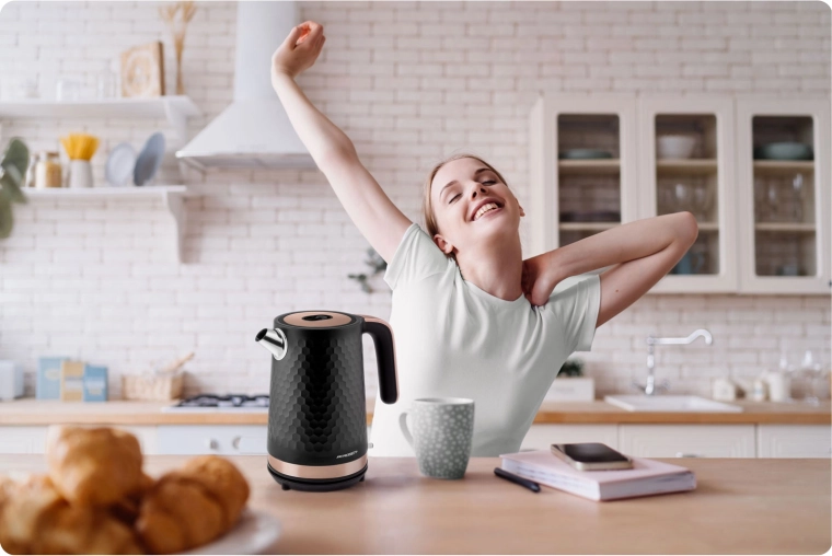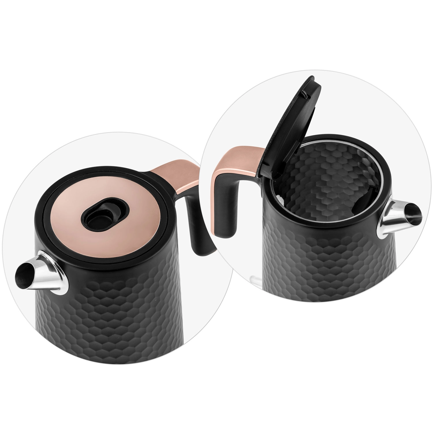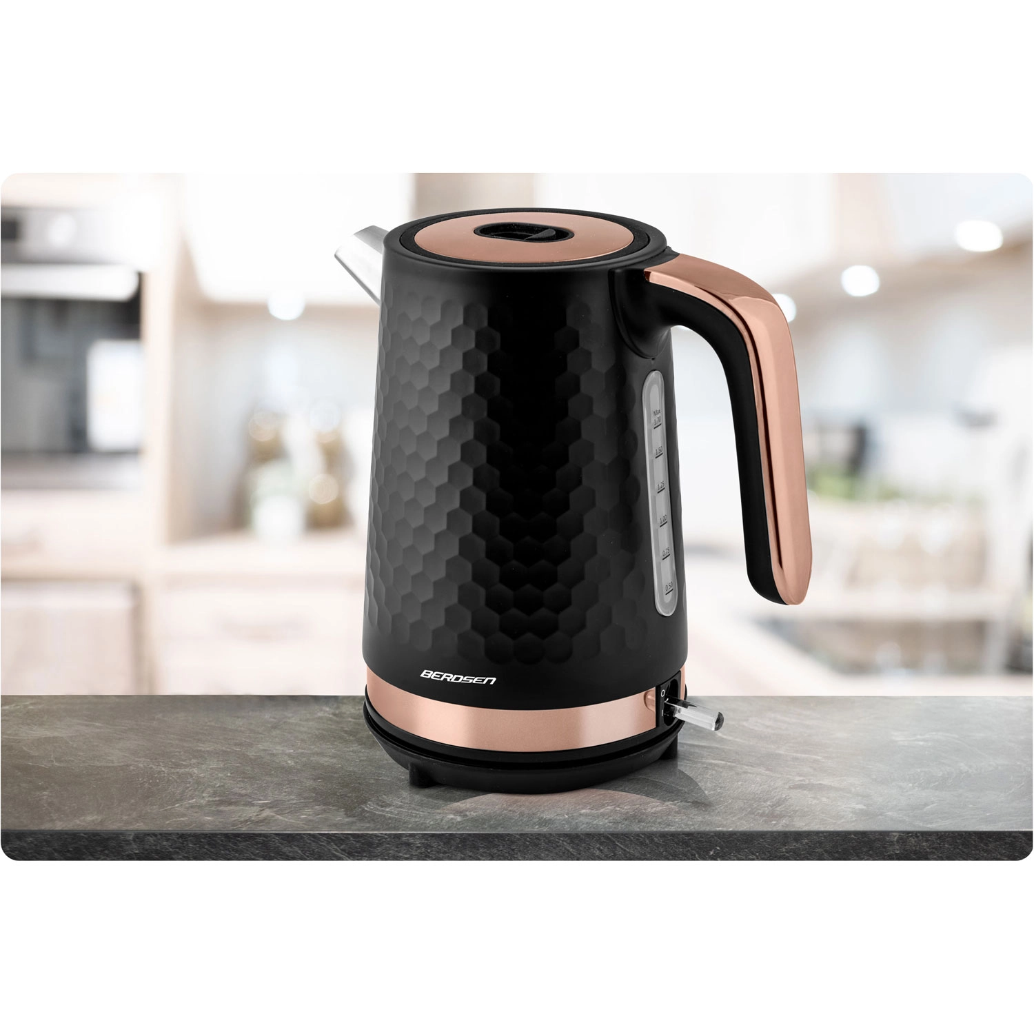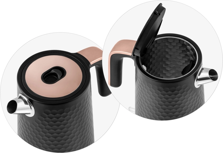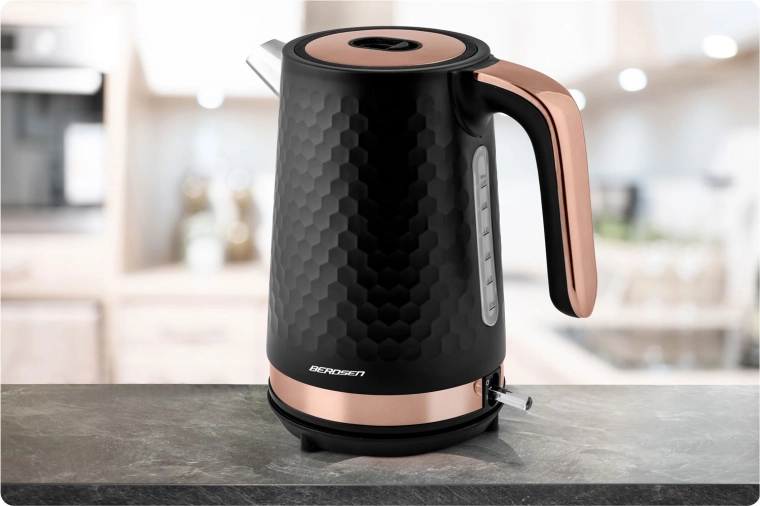 The elegant Berdsen kettle in black–copper is designed for convenient everyday use. The metal body with a matte finish is durable and easy to maintain, while the ergonomic handle stays cool to the touch. With 1850–2200 W of power, it boils water quickly and efficiently.