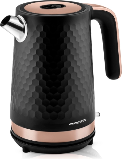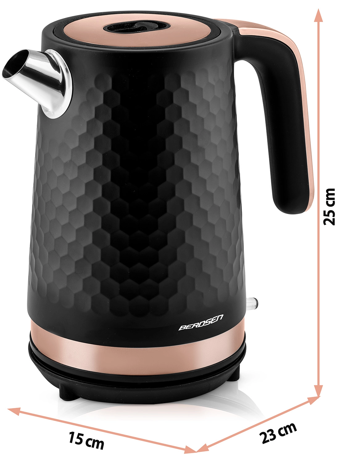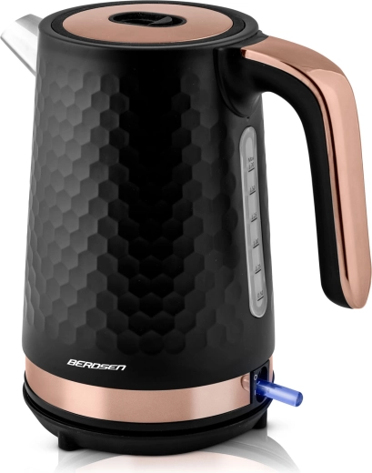 The stylish Berdsen electric kettle with a 1.7 L capacity combines a matte metal finish, fast heating 1850–2200 W, and a safe cool-touch handle. It offers a 360° rotating base, a illuminated switch, a removable metal limescale filter, and non-slip feet for convenient and safe use.