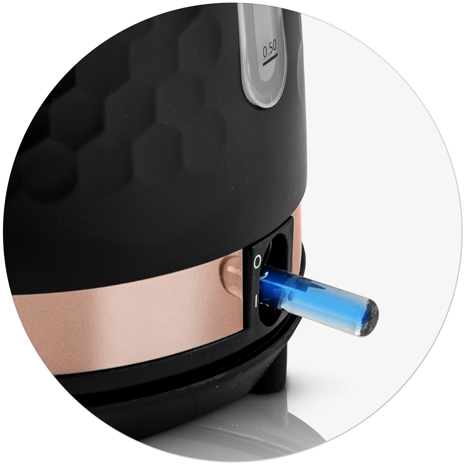 Practical details such as the 360° rotating base for both right- and left-handed users, the illuminated switch, and the water level indicator ensure intuitive handling. The removable metal filter captures limescale so you can enjoy the pure taste of tea and coffee. Boil-dry protection and stable non-slip feet add safety.