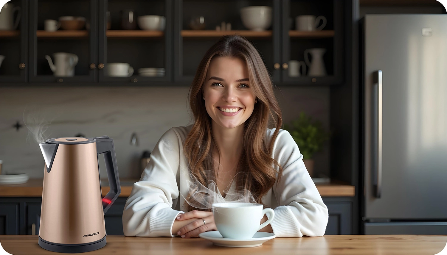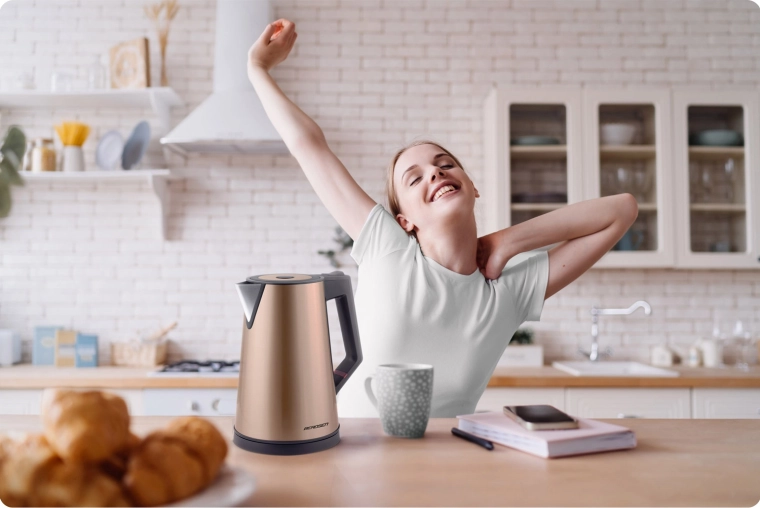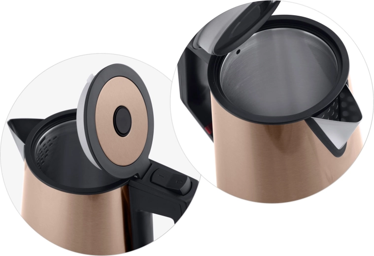 Discover a perfectly balanced blend of design and functionality. The double-wall CoolTouch construction ensures the kettle doesnt overheat on the outside, while the high-quality SUS 304 stainless steel inner vessel guarantees a pure water taste without unwanted odors. The copper-gold finish looks premium and pairs beautifully with modern kitchens.