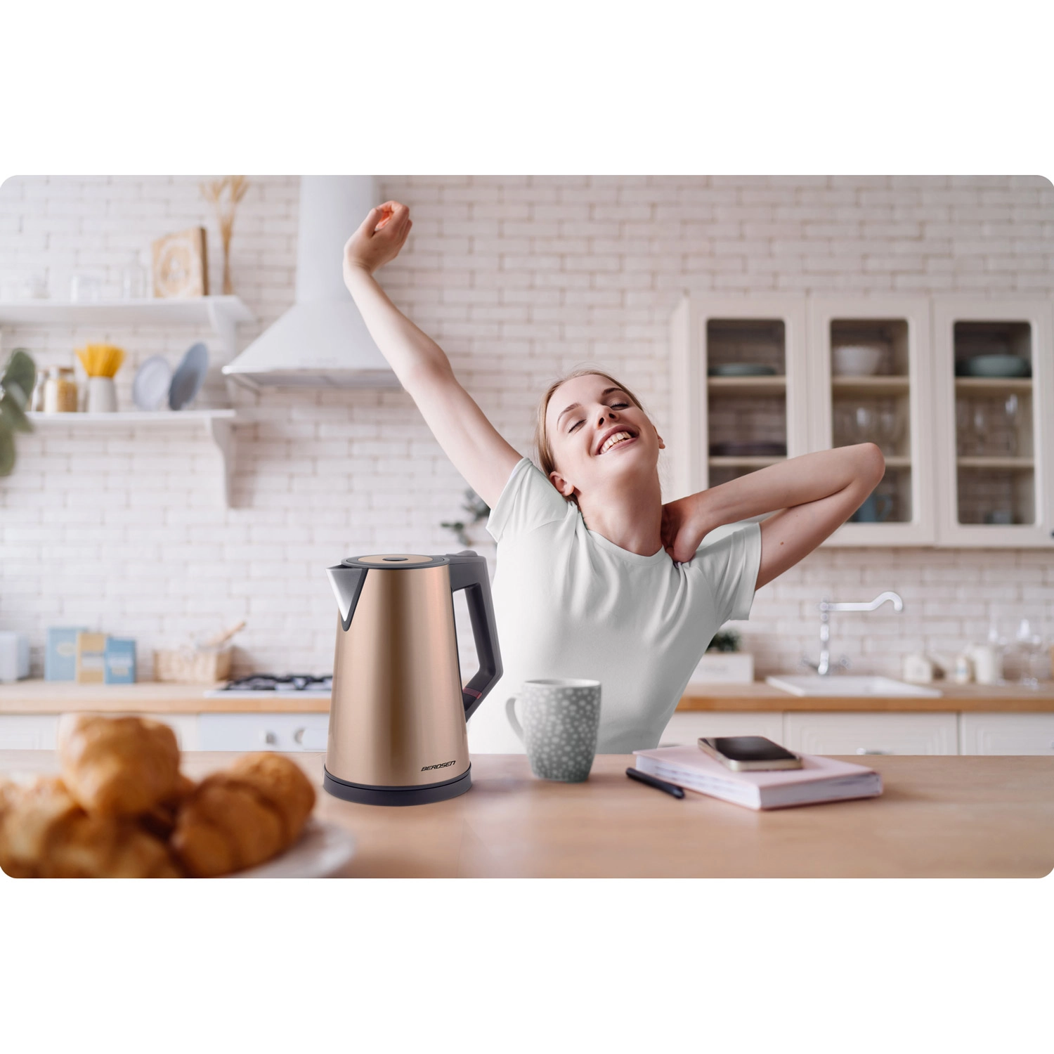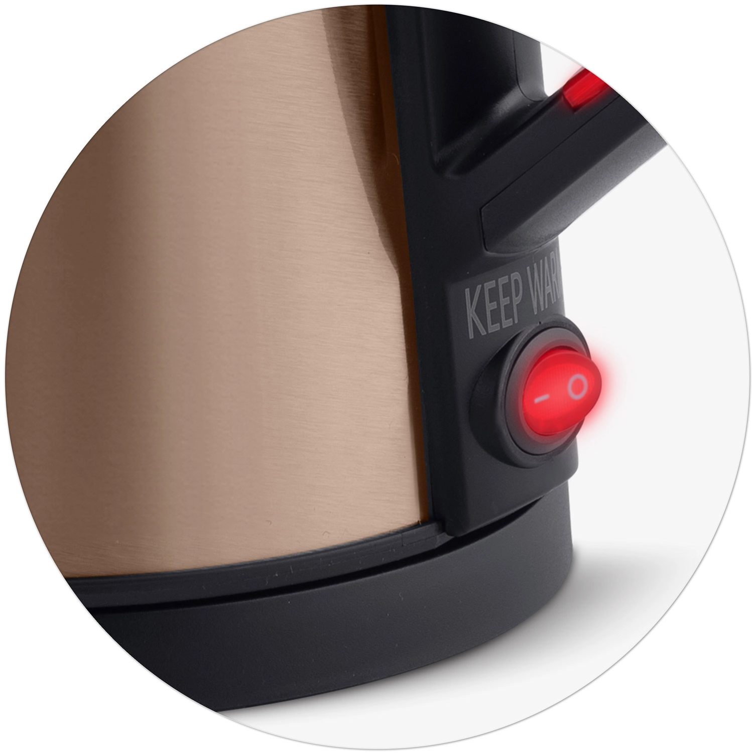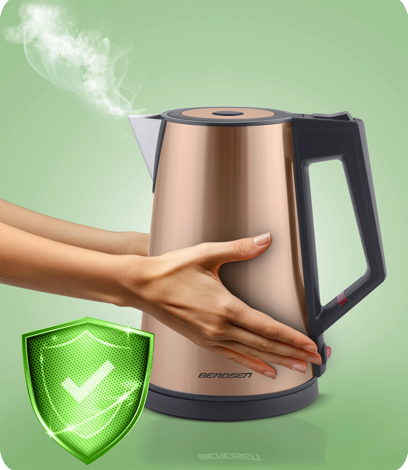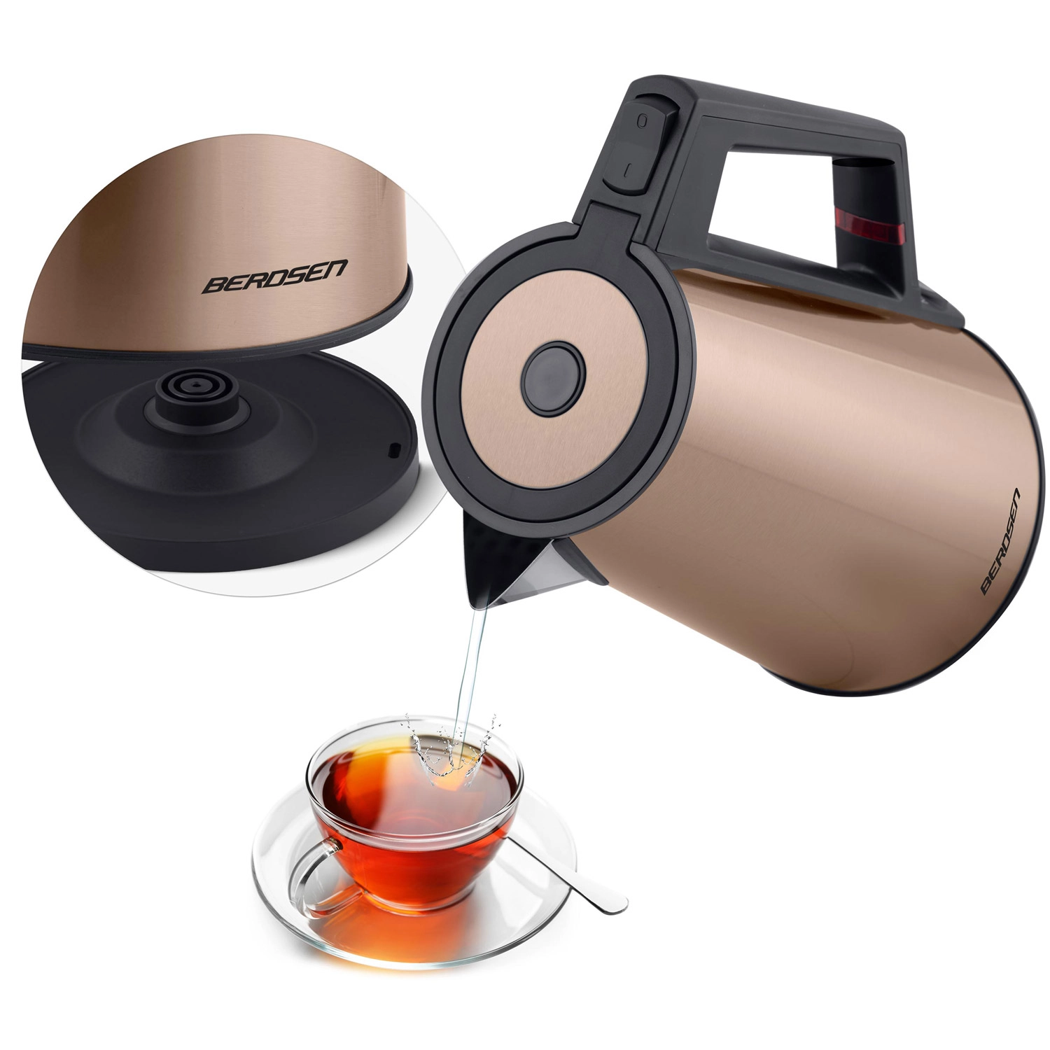 Stylish electric kettle BERDSEN with a capacity of 1.7 L in an elegant copper finish offers an insulated CoolTouch design, an interior made of SUS 304 stainless steel, and a practical keep-warm function for up to 2 hours. Thanks to the wireless 360 base, illuminated switch, and safety overheat protection, it is an ideal choice for everyday boiling.
