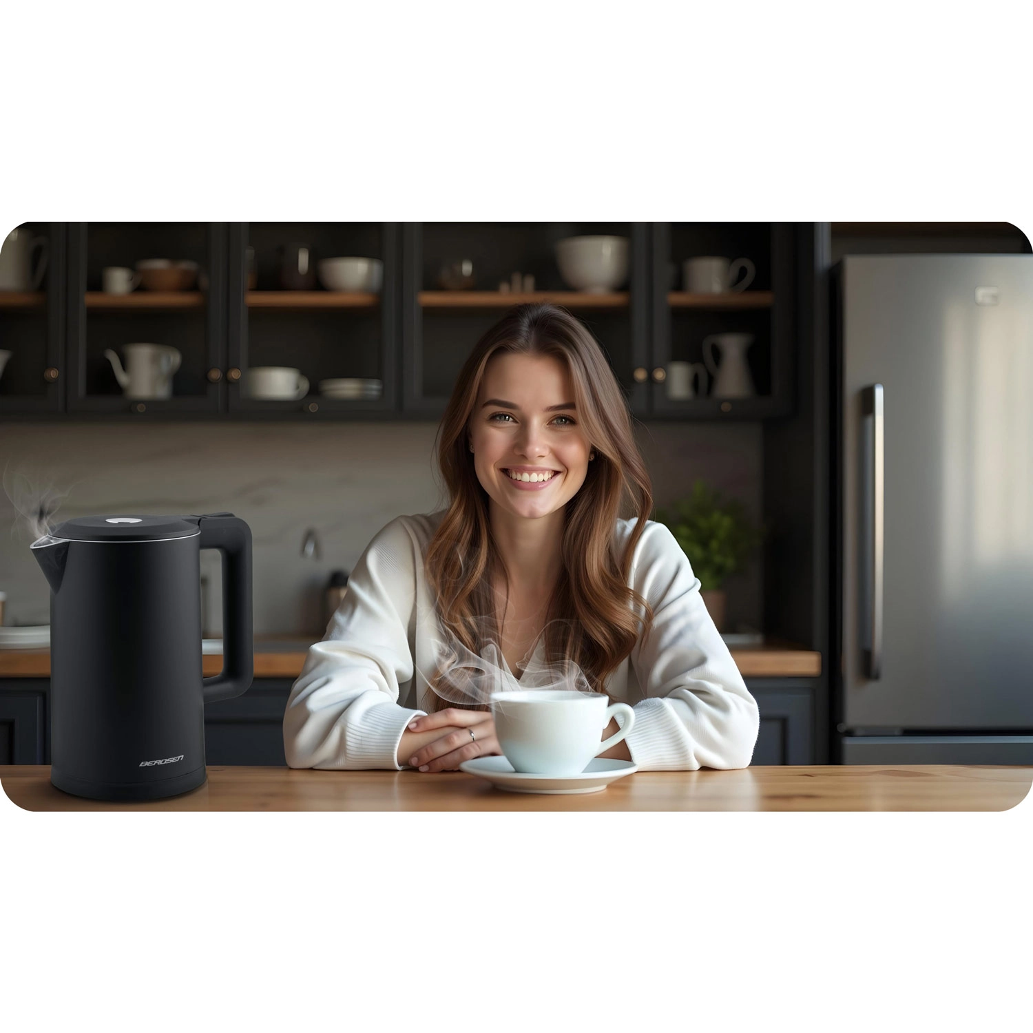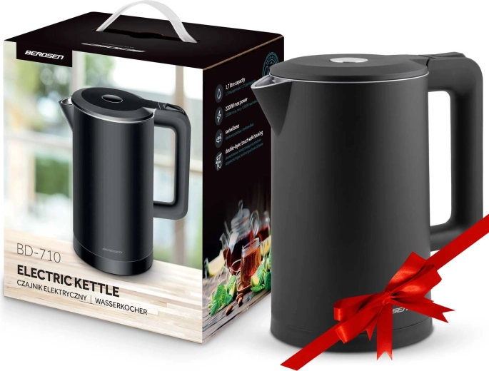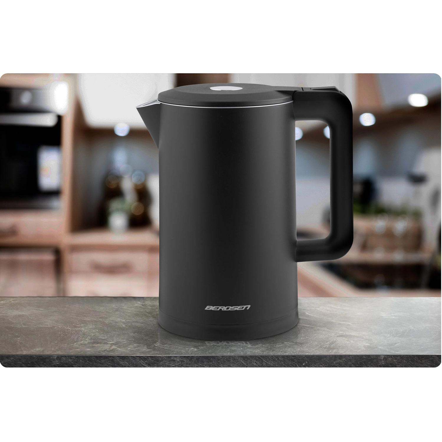 The stylish BERDSEN electric kettle with a 1.7 L capacity combines SUS304 stainless steel for pure water taste and an insulated CoolTouch2 construction for safe, burn-free use. It offers 18503220 W power for fast boiling, a 3606 rotating base, a LED backlit strip, and thoughtful details like a cord compartment and non-slip feet.