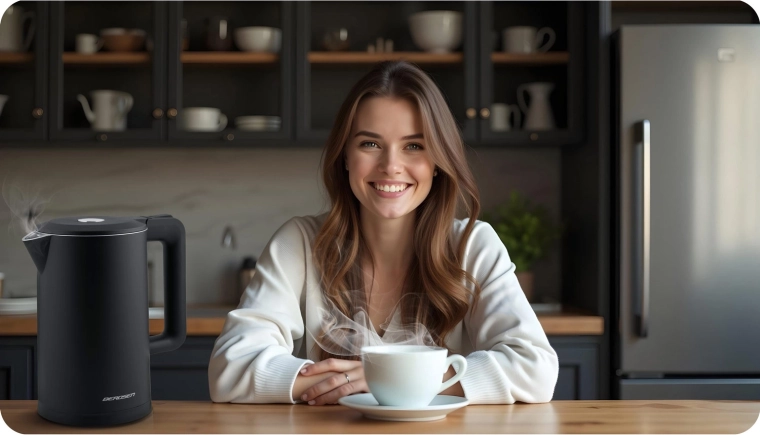 The insulated design with a stainless-steel interior and durable shell ensures a cooler surface, better heat retention, and comfortable handling even after boiling.