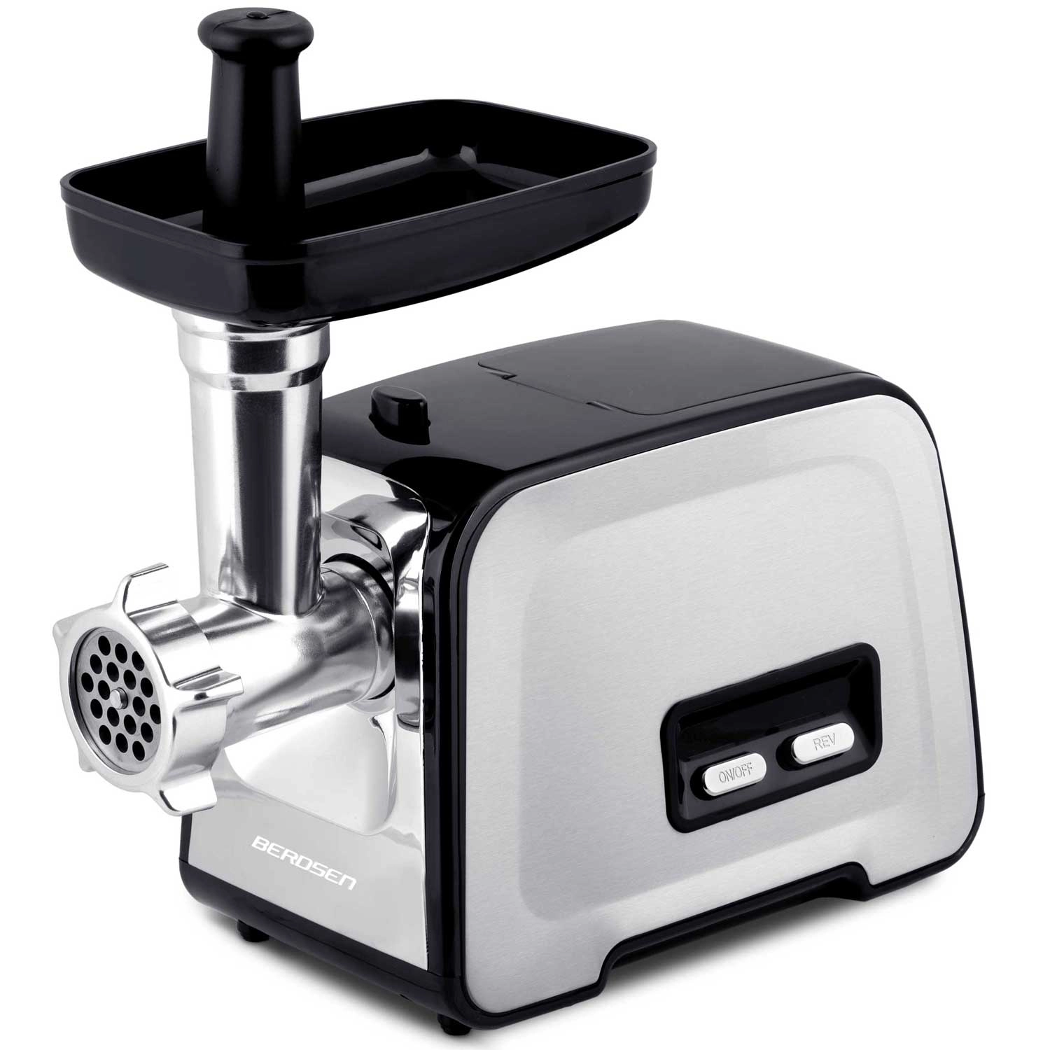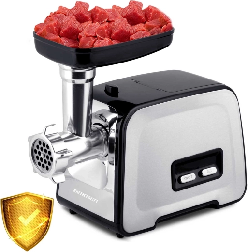 The powerful BERDSEN electric meat grinder offers a maximum peak power of 1200 W, a reverse function to release ingredients, and a metal auger with durable gears for long service life. With 3 interchangeable discs (3/5/7 mm), you can prepare fine or coarse grinds, homemade sausages, and kebbe. Easy to use, safe to operate (LFGB, BPA free), and a practical built-in storage compartment for accessories saves space and time.