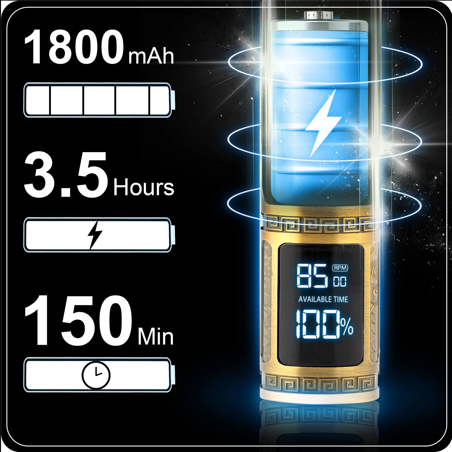 Track remaining time and battery level on the clear LCD. The 1800 mAh Li‑Ion battery provides up to 2.5 hours of operation—ideal for complete hair and beard grooming.