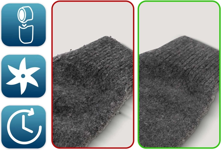 Thanks to the ergonomic design and a large debris container (120 ml), it’s comfortable to use and easy to maintain. The lint remover is great for sweaters, coats, cardigans as well as upholstery, blankets, and pillows. The box includes everything needed for immediate use, including a USB‑C cable and a cleaning brush.
