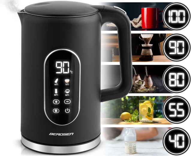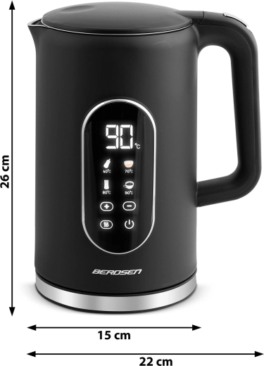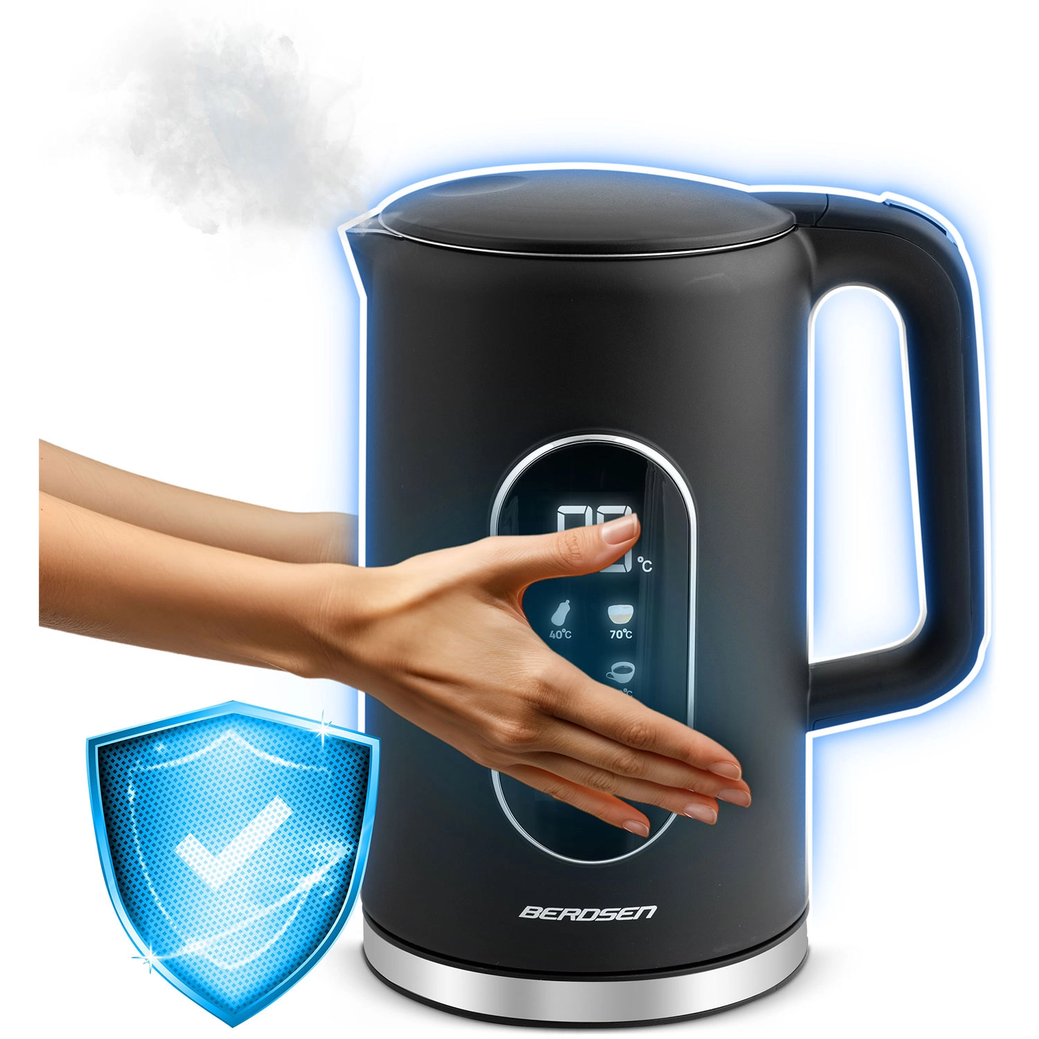 Modern BERDSEN kettle with 1.7 L capacity featuring a touch control panel, precise temperature setting in 5 °C steps, and a keep-warm mode for up to 2 hours. Thanks to the double-wall CoolTouch design, the exterior stays cool. It offers fast and quiet heating with up to 2200 W power and a SUS 304 stainless-steel interior for pure water taste. The elegant backlit display adds style to your kitchen.