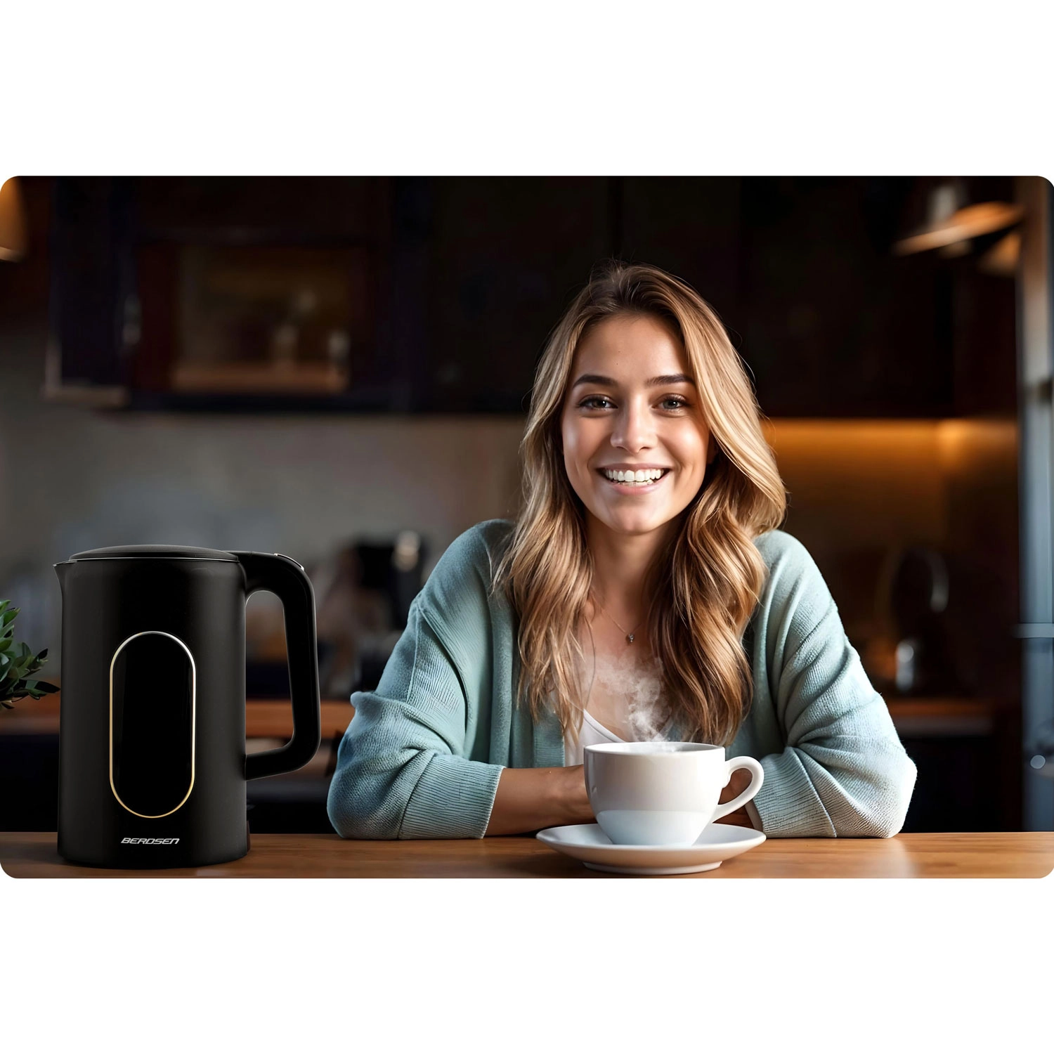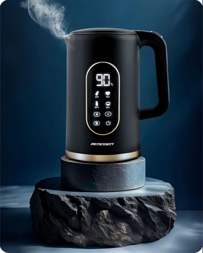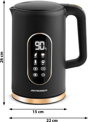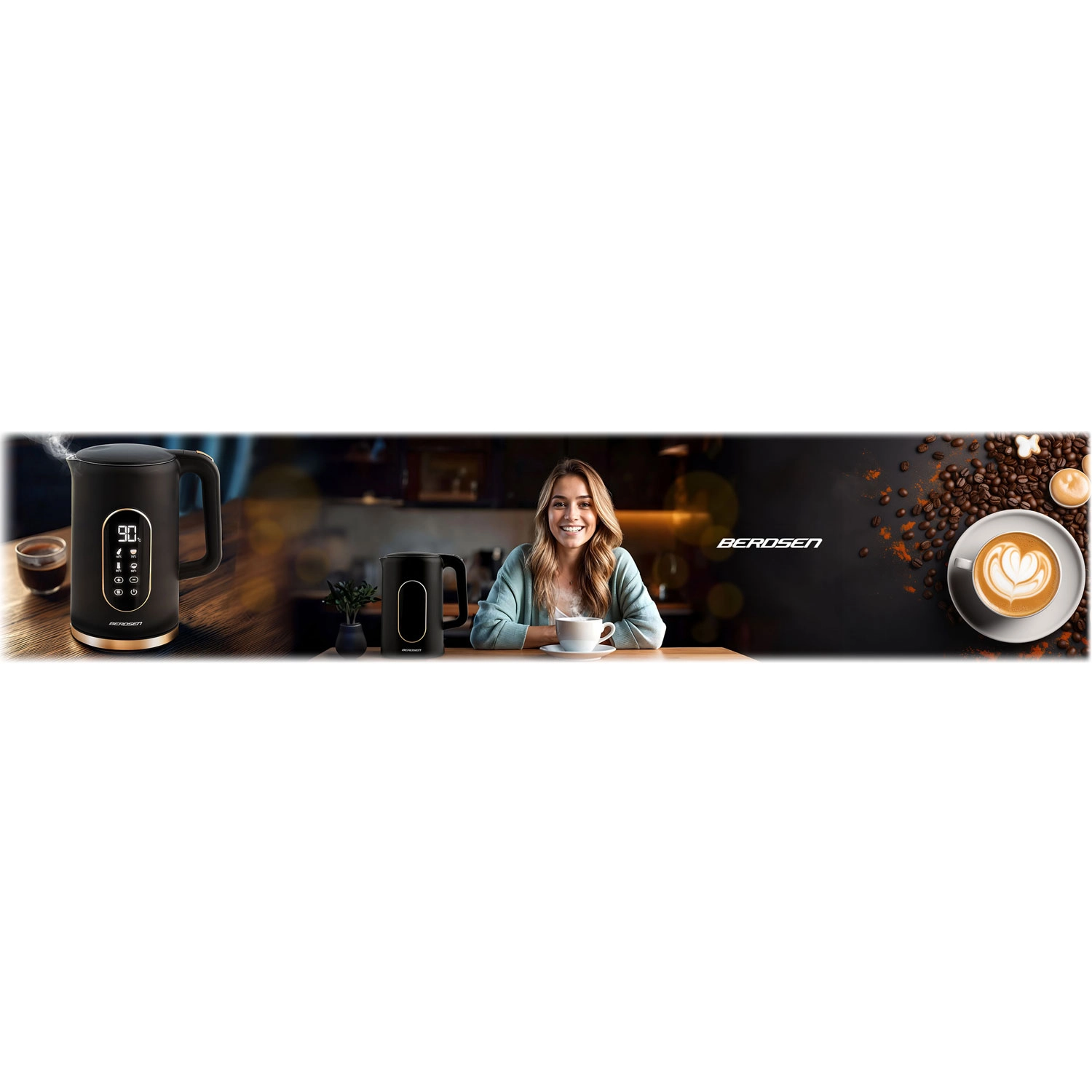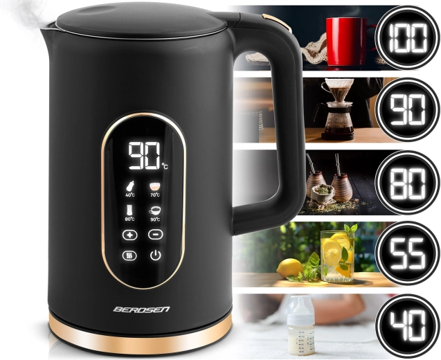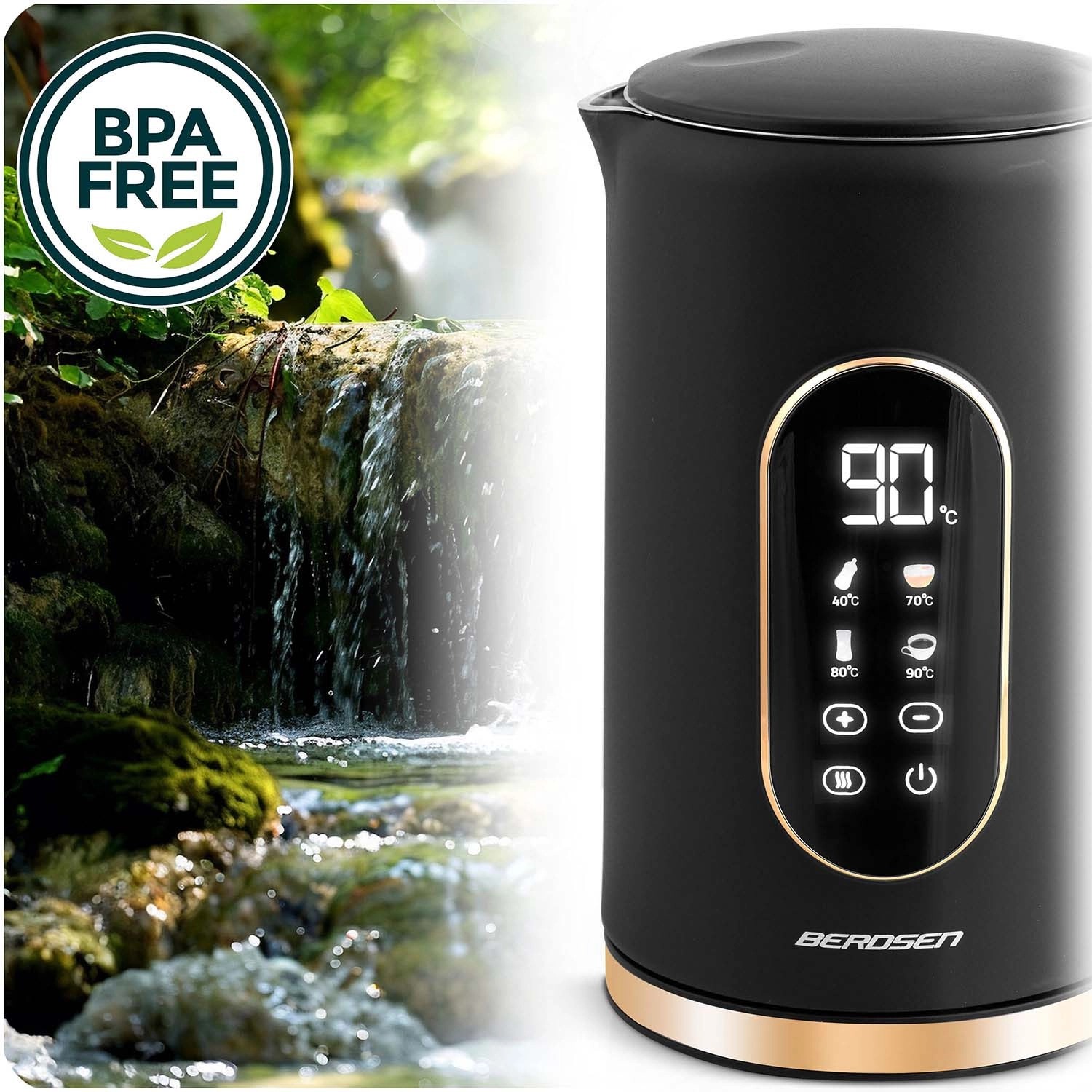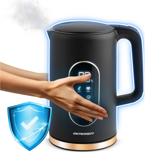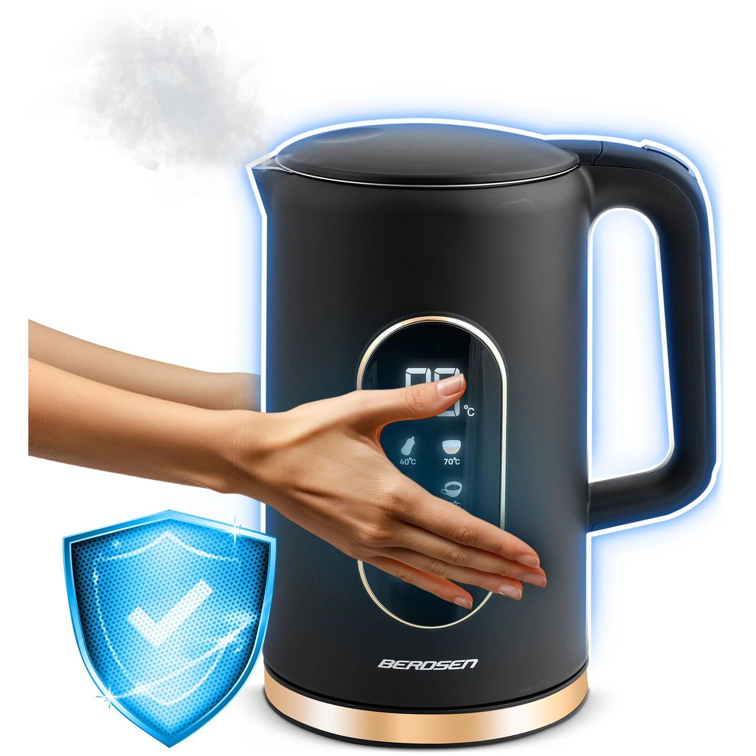 A stylish 1.7 L electric kettle from BERDSENprecise temperature setting in 5 °C steps with presets 40/70/80/90/100 °C, a touch panel with LED backlight, and a Keep Warm function for up to 2 hours. The double‑layer CoolTouch™ body ensures safe handling, the SUS 304 stainless steel interior keeps water tasting pure, and power up to 2200 W delivers fast and quiet heating.
