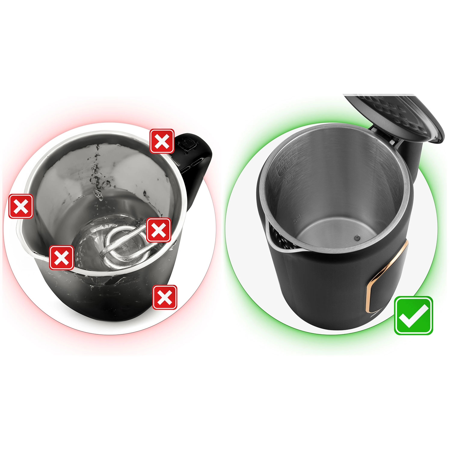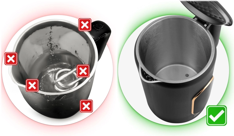 Smooth SUS 304 stainless interior walls without crevices simplify maintenance, improve water taste, and extend kettle lifespan. BPA free.