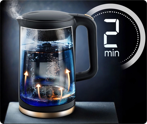 The powerful heating system 1850–2200 W provides a fast and quiet boil in 2–5 minutes. A practical spout with a drip‑free gooseneck, a 360° rotating base, and button‑operated lid opening make everyday drink prep a pleasure.