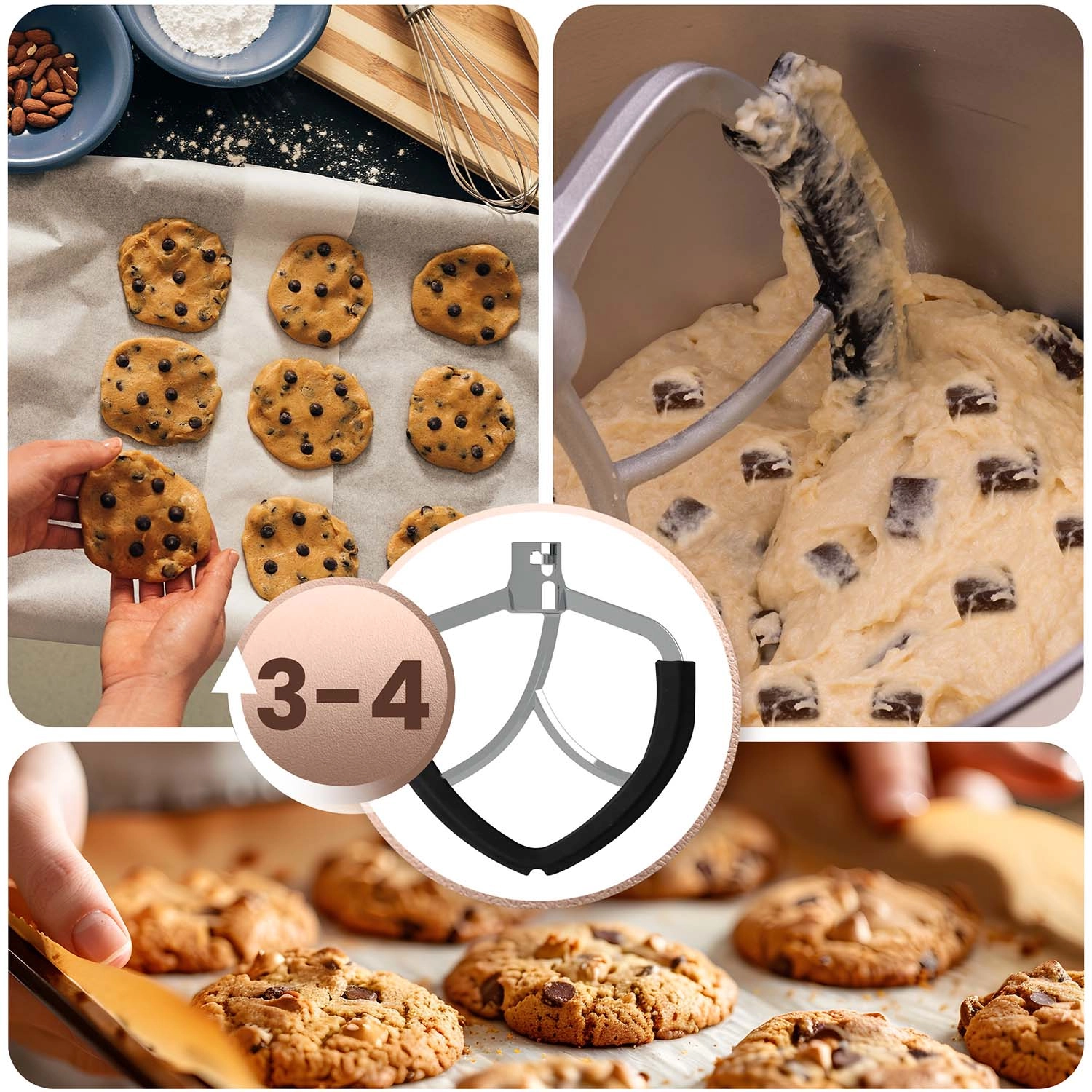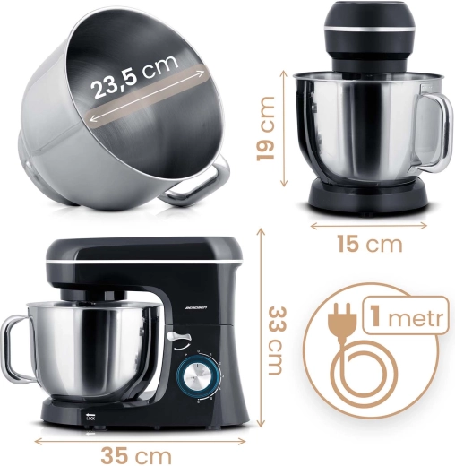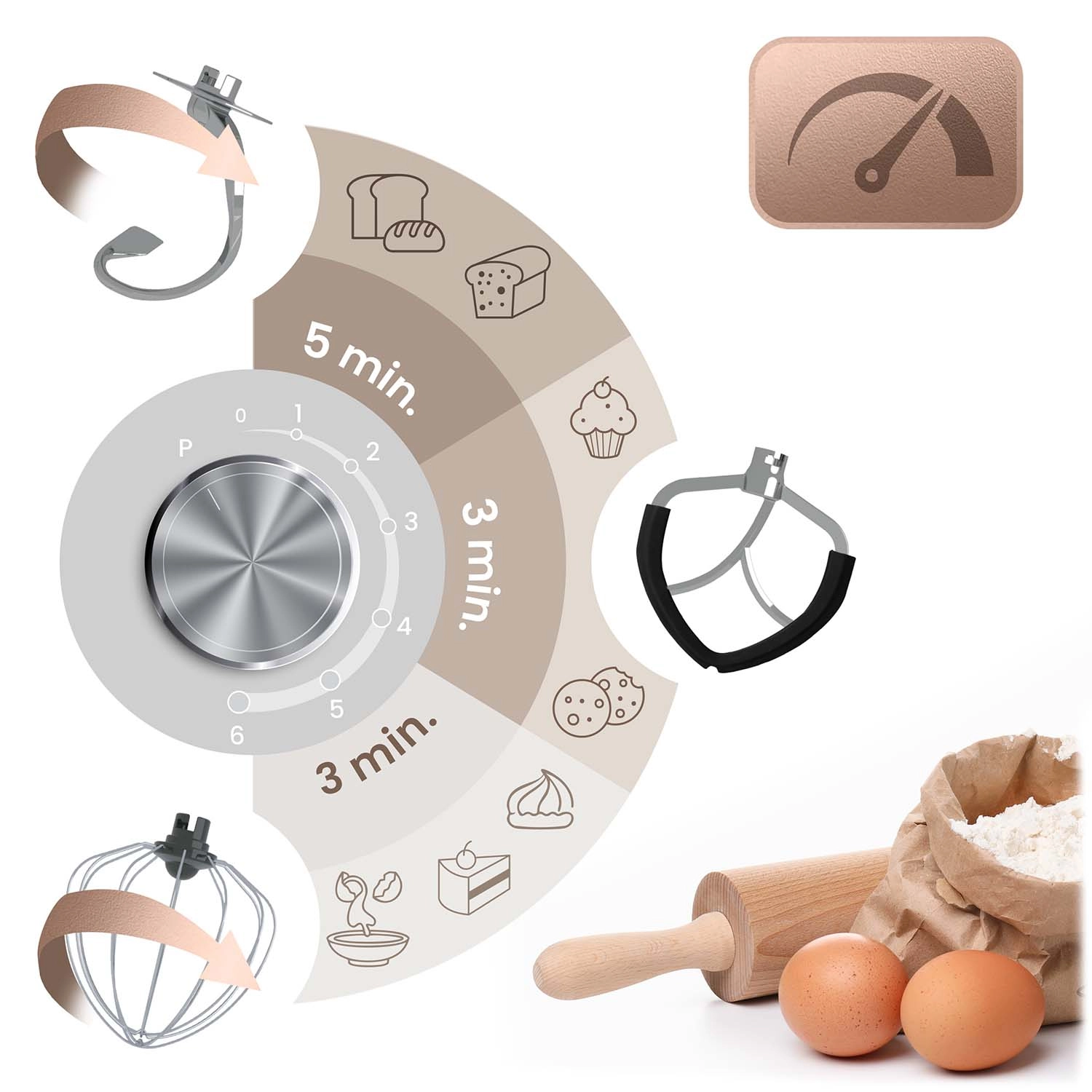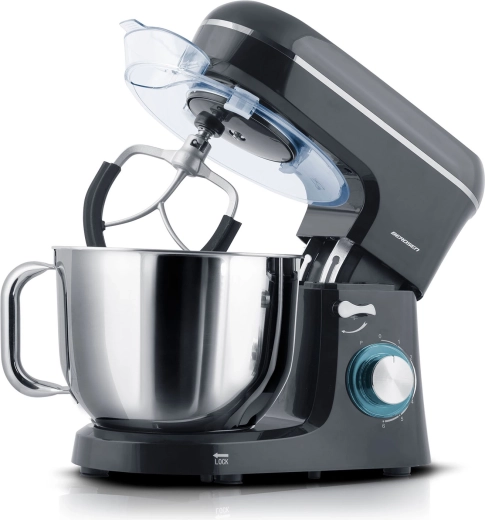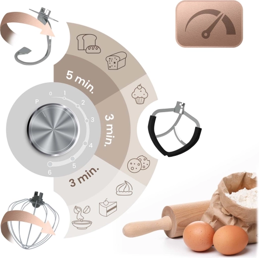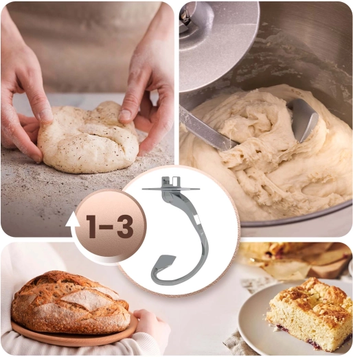 • 3 attachments included: dough hook (speeds 1–3), flat beater (2–4), whisk (5–6) for perfect textures from yeasted doughs to airy creams.