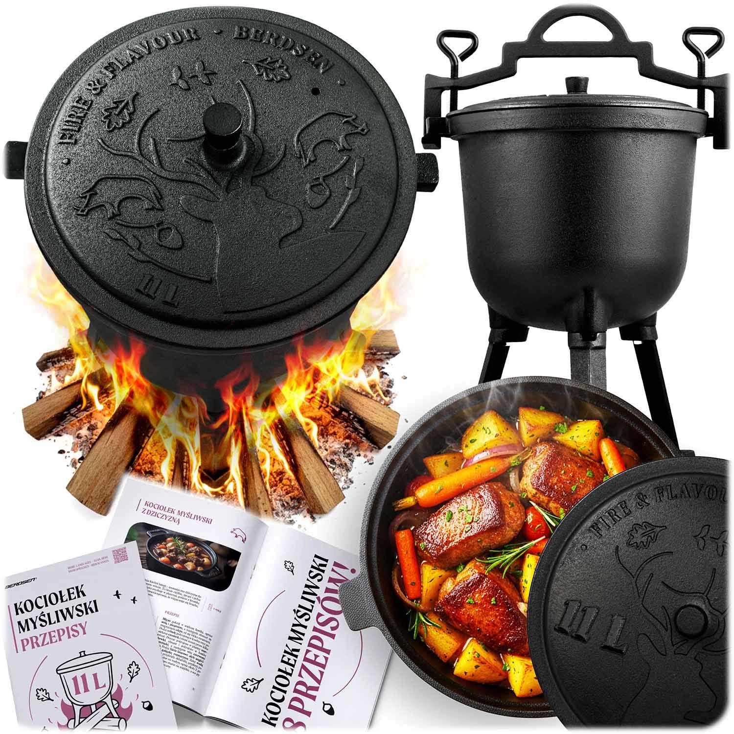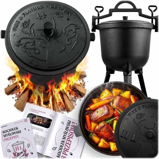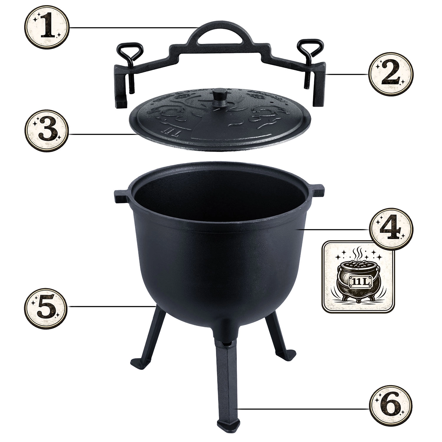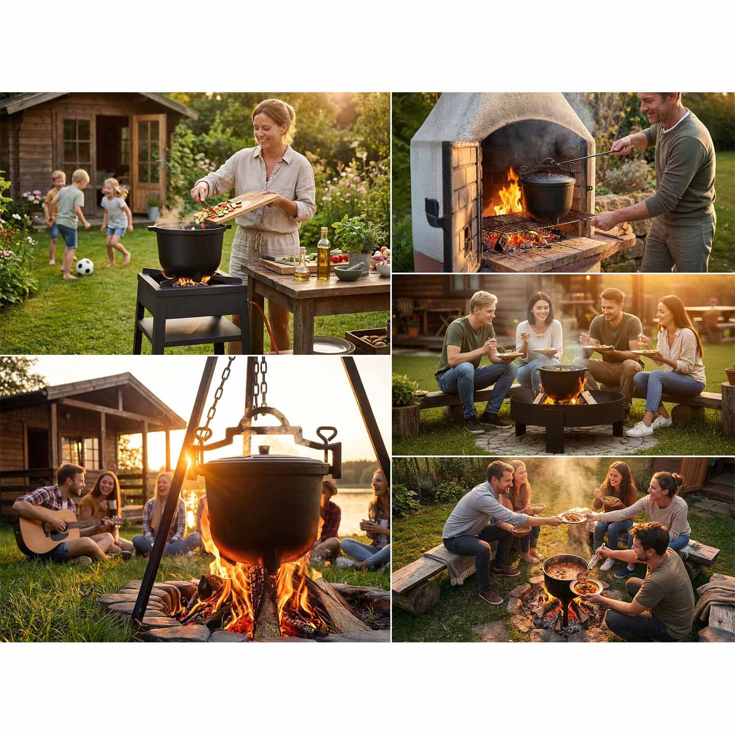 Discover honest outdoor cooking with a robust 11 L cast-iron cauldron. Thanks to its thick walls, it stores heat excellently, cooks evenly without burning, and brings out the deep flavors of stews, roasts, and soups. With a vented lid, removable legs, and a hanger handle, it’s ready for open fire, grill, or gas stove.