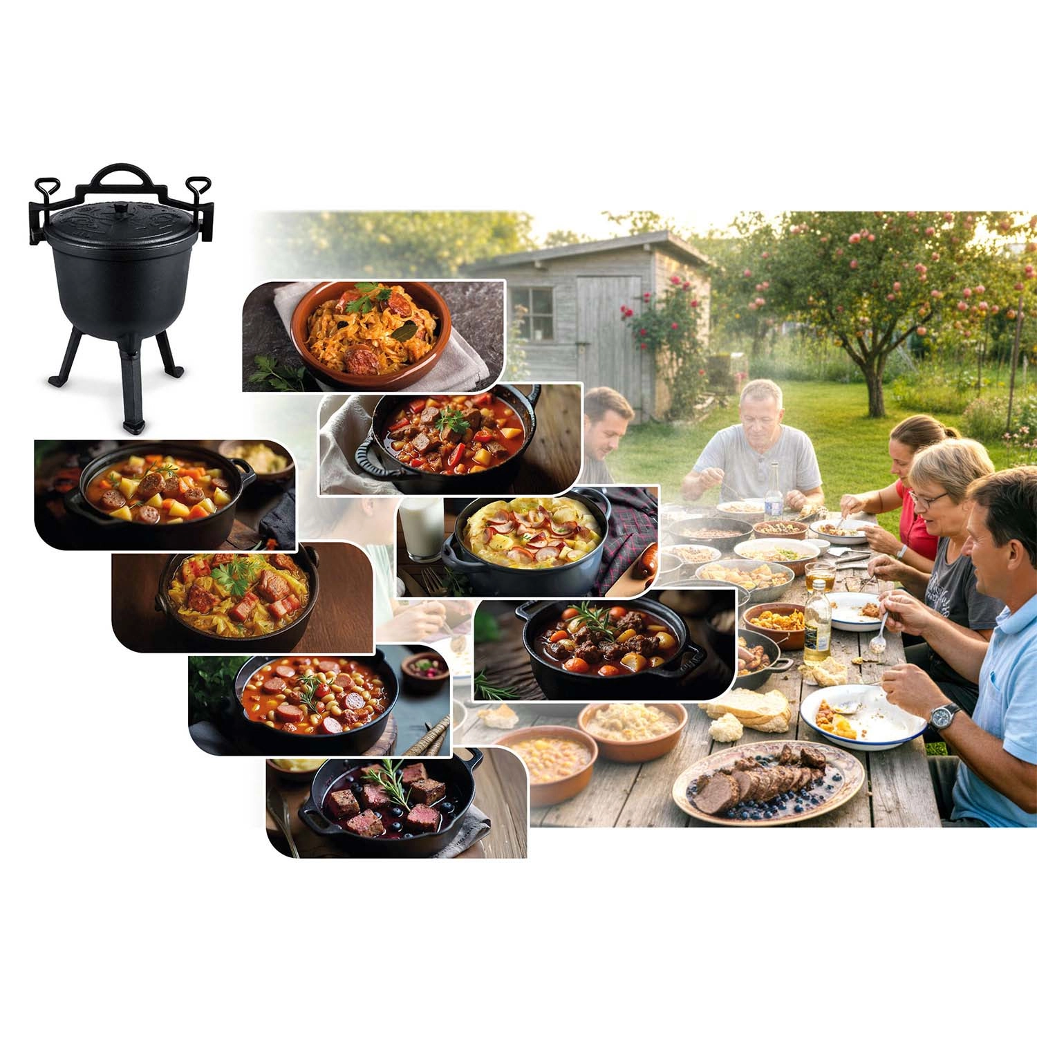 This traditional cast-iron cauldron is ideal for open fire, backyard grill, and gas stove. The solid construction ensures stability, long heat retention, and gentle simmering—meat becomes beautifully tender and vegetables soak up flavor. The heavy vented lid traps steam and aroma inside, so results are always juicy and full of taste.