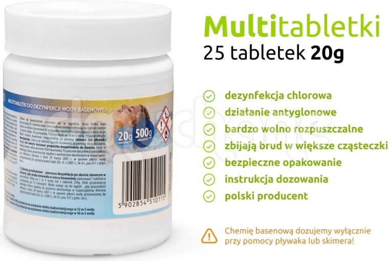 - 1 tablet (20 g) per approx. 2000 l of water lasts about one week.