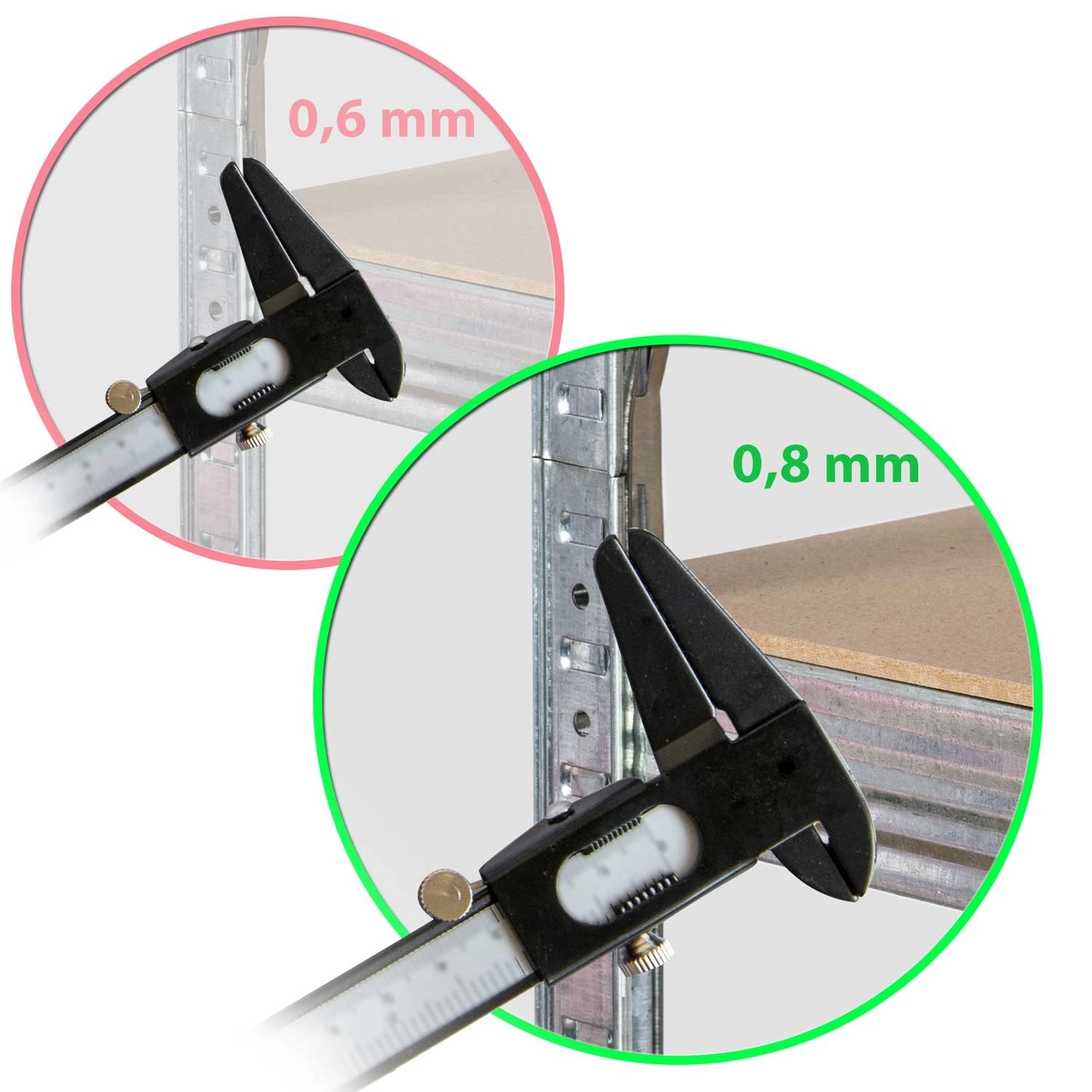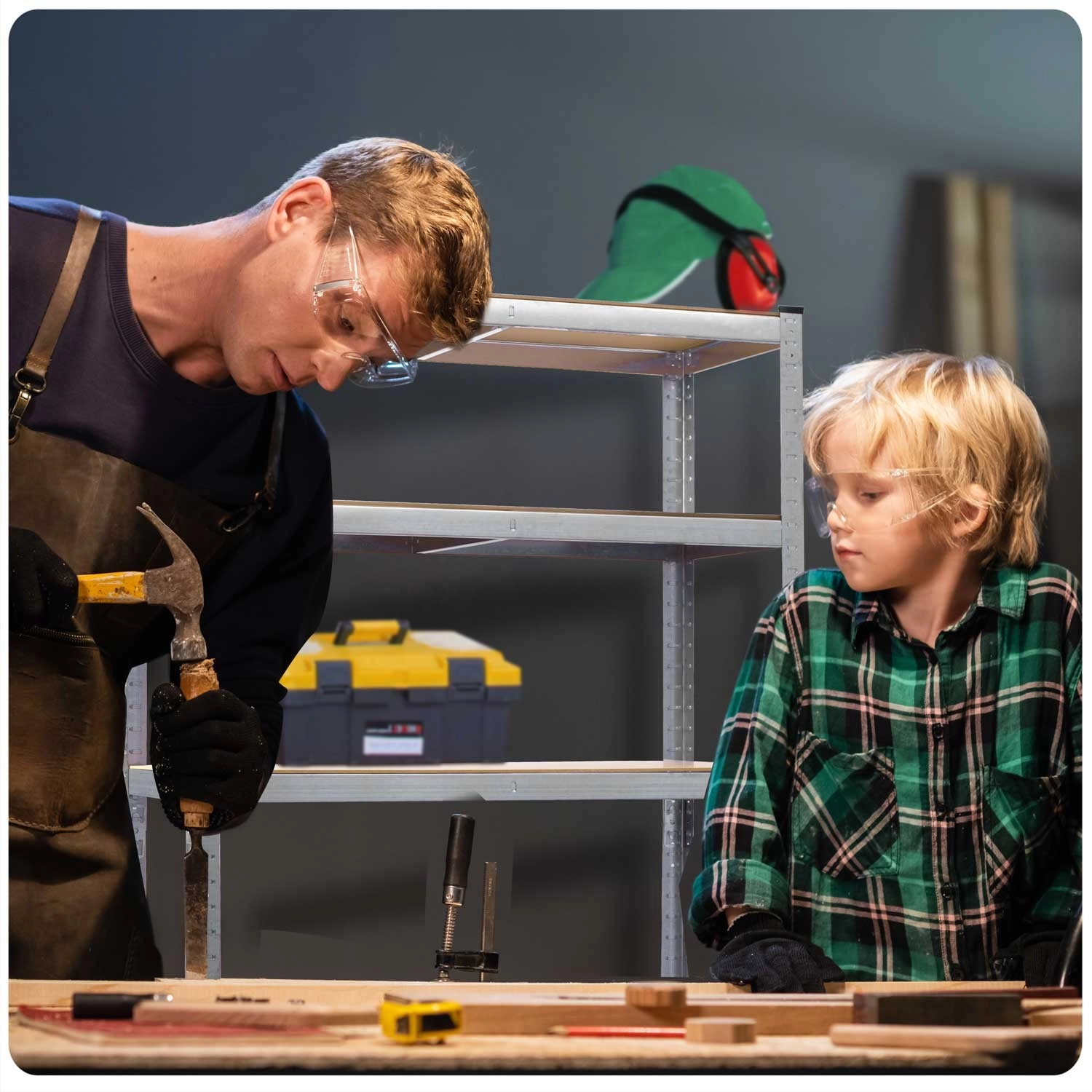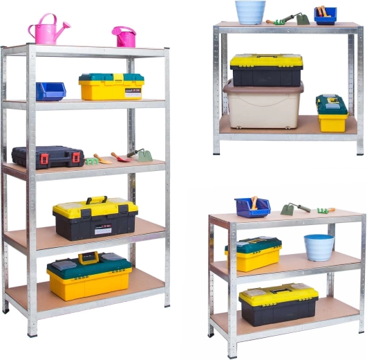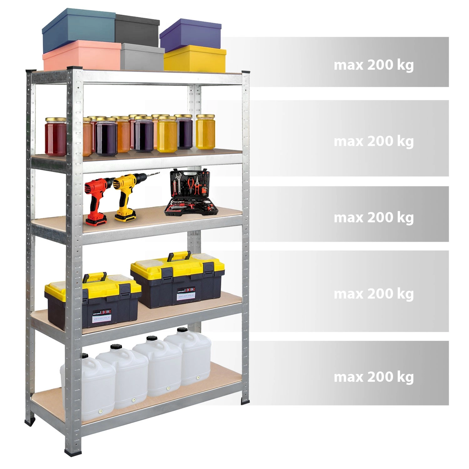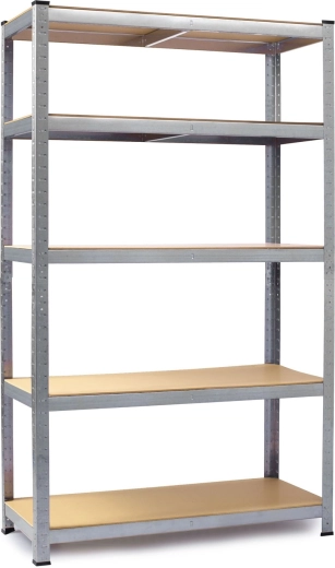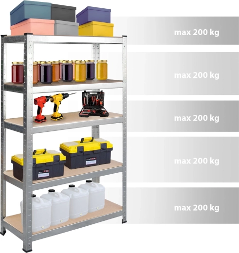 The HUMBERG rack is designed for everyday use and organized storage of tools, boxes, and supplies. Galvanized steel profiles with a thickness of 0.8 mm ensure exceptional stability and long life, while five 5 mm MDF shelves with central reinforcements safely carry heavy items. The boltless system enables quick and easy assembly without tools.