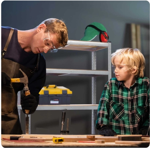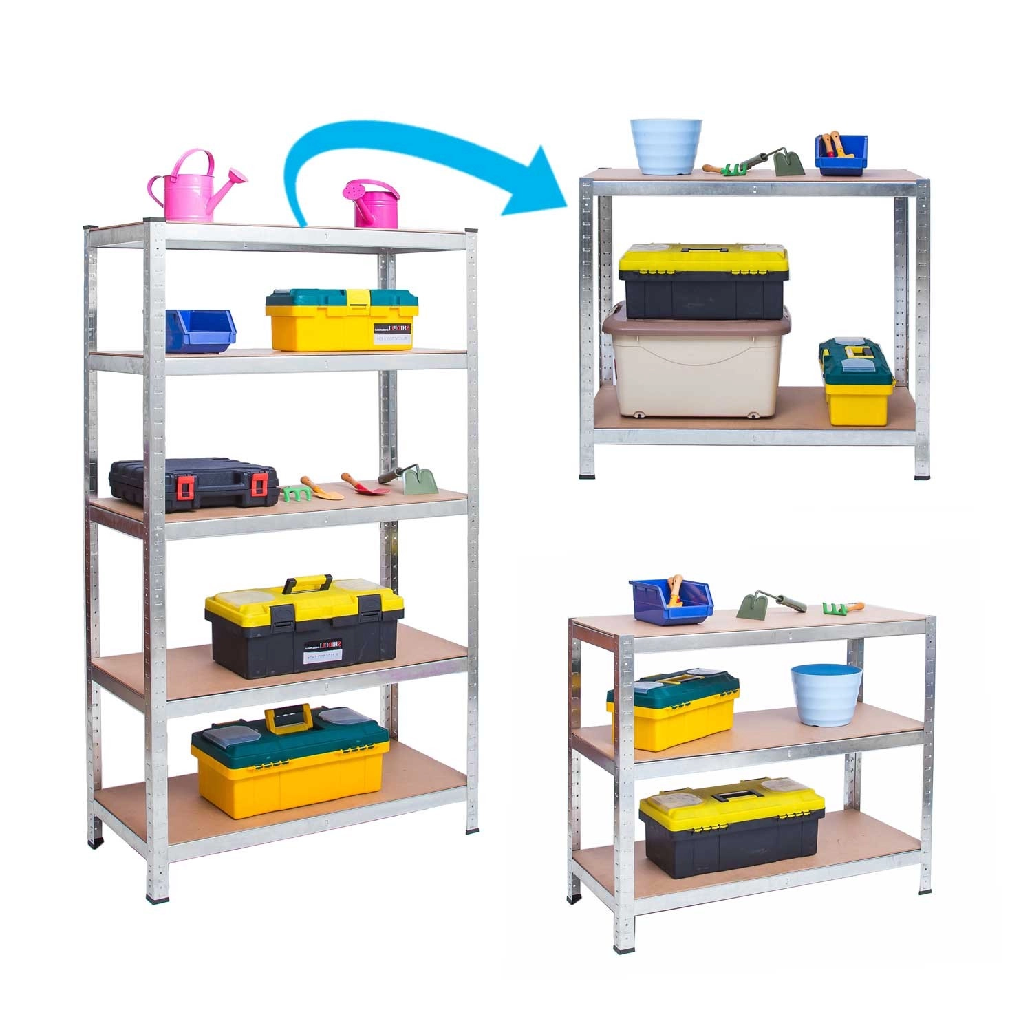 The shelf height can be adjusted in 40 mm increments and the entire unit can be divided into two smaller ones. This makes it easy to use space in the garage, workshop, or basement.