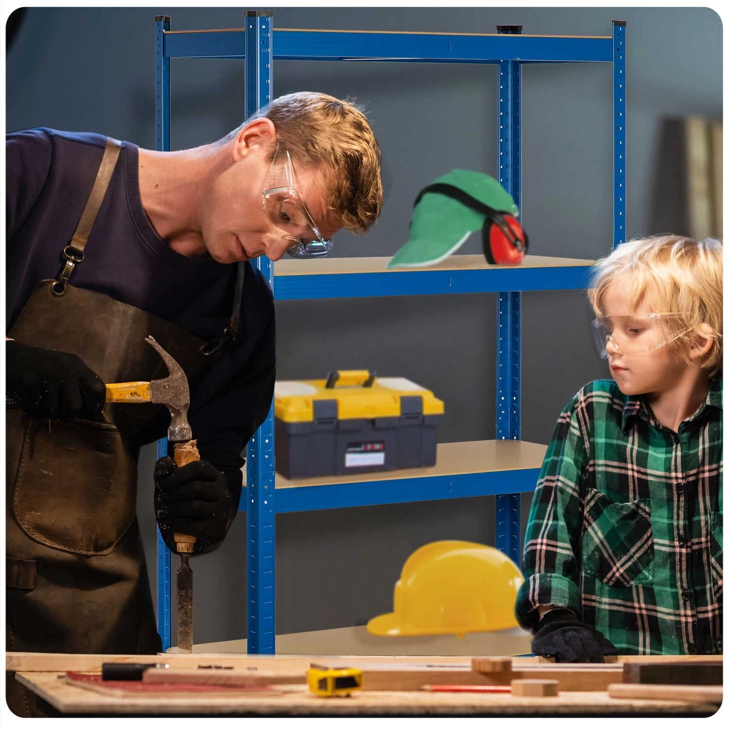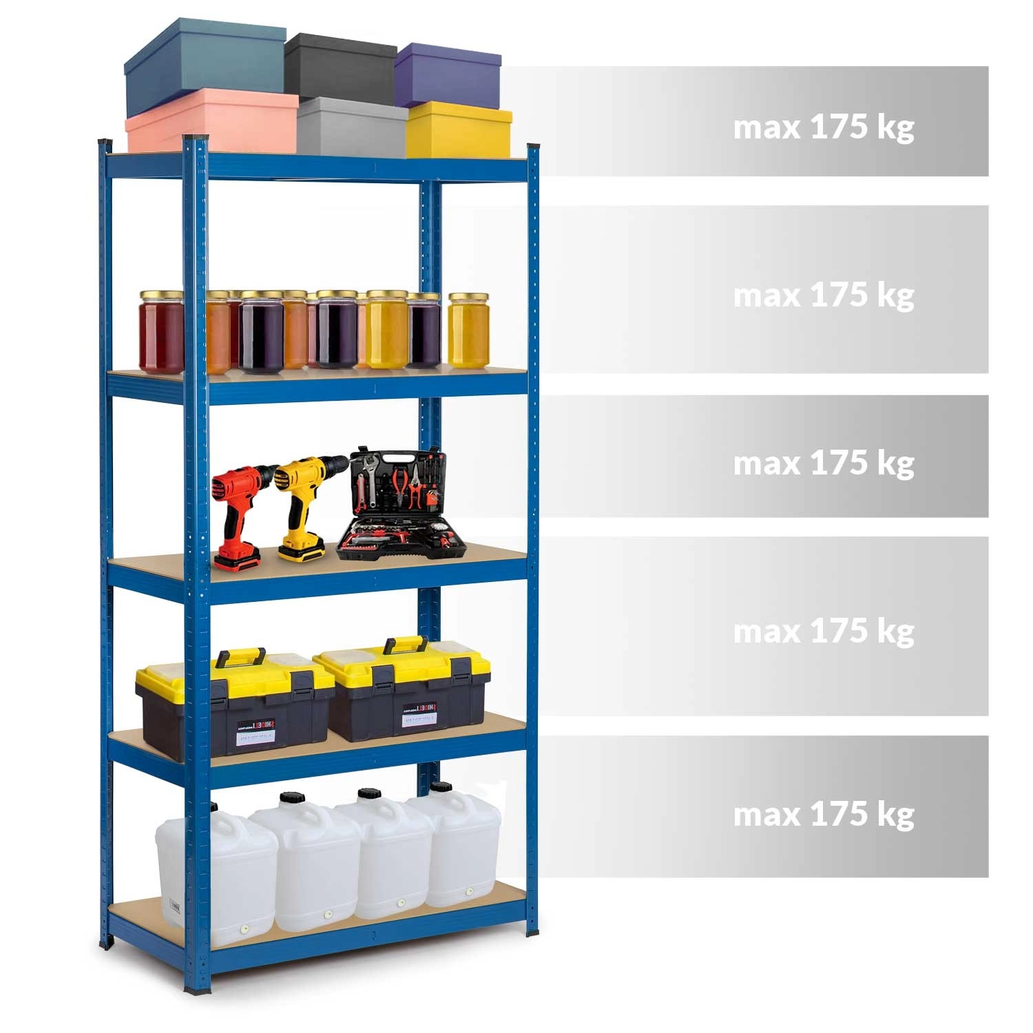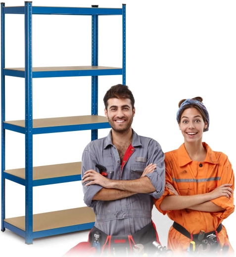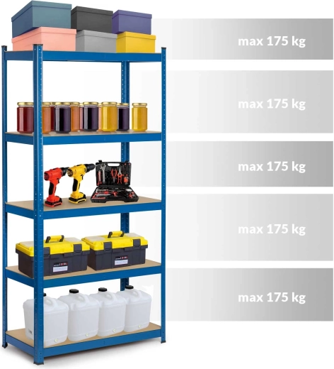 The versatile HUMBERG metal shelving unit in blue, measuring 180 × 90 × 30 cm, offers 5 durable MDF shelves, a total load capacity up to 875 kg, and screwless click-in assembly. With adjustable shelf height, the option to split into two smaller racks or use it as a workbench, it’s ideal for the garage, basement, workshop, archive, and storage. Rounded edges and protective foot caps ensure safety and protect floors.
