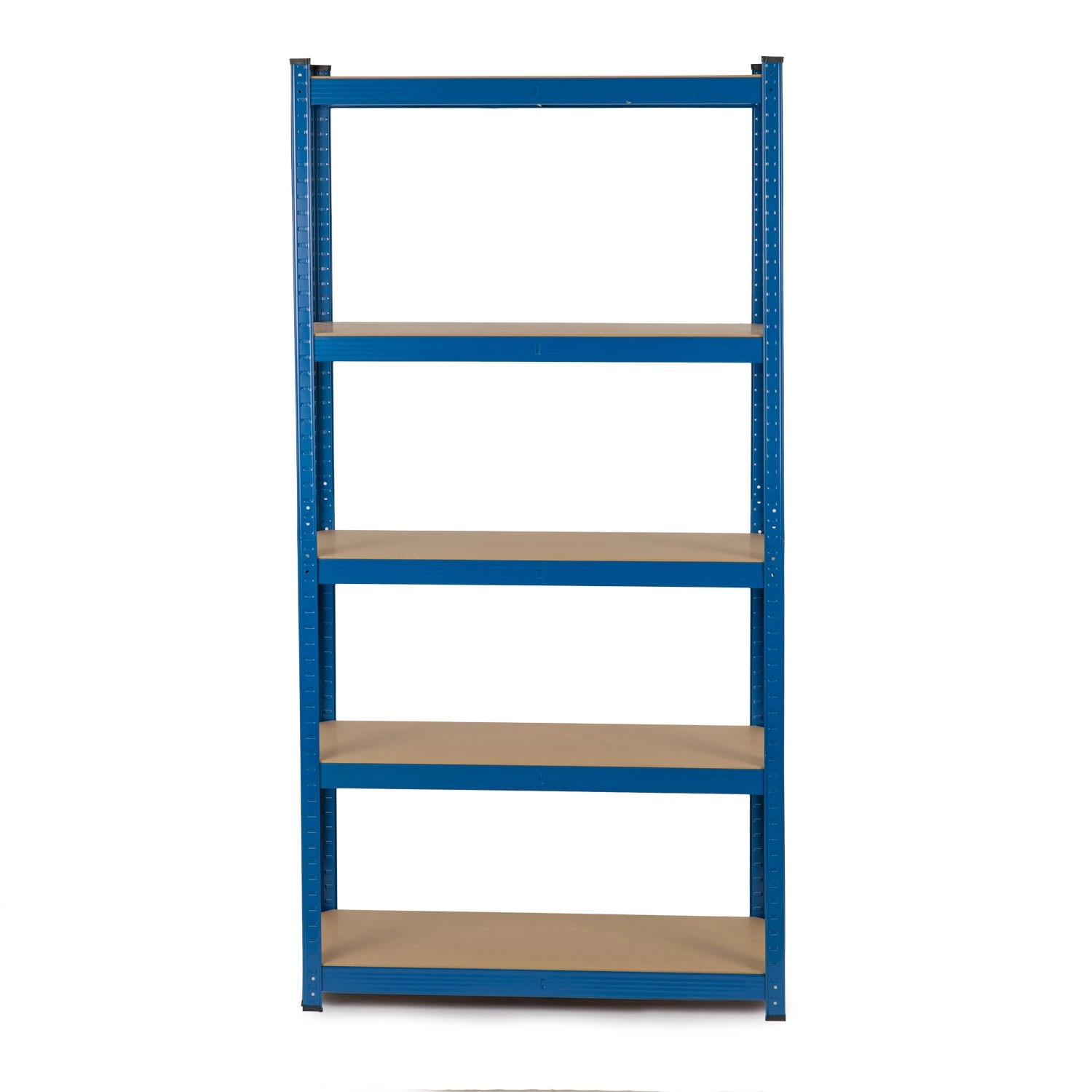 Five MDF shelves with central reinforcements support up to 175 kg per shelf (875 kg total). Plastic foot caps increase stability and protect the floor.