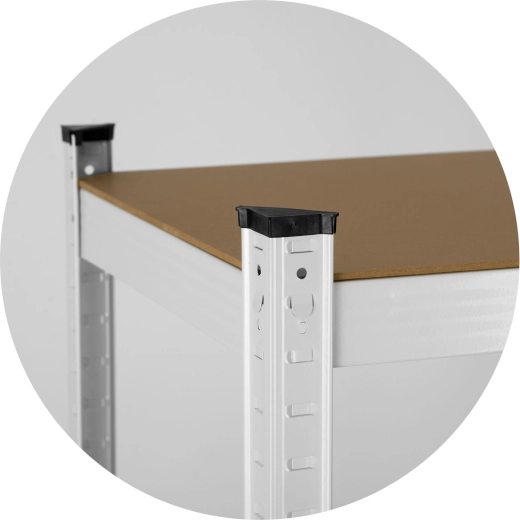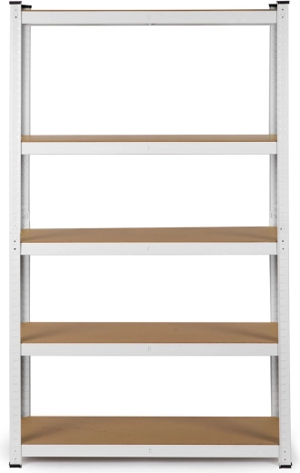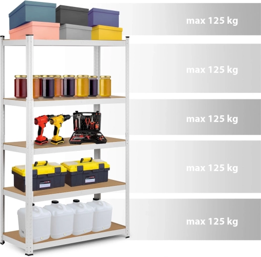 The steel frame with central reinforcements and 5 MDF shelves holds up to 125 kg per shelf, 625 kg in total – perfect for tools, boxes, and supplies.