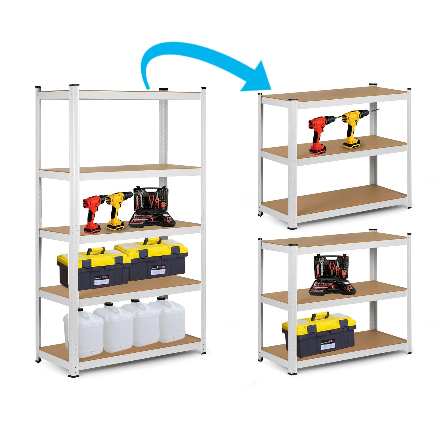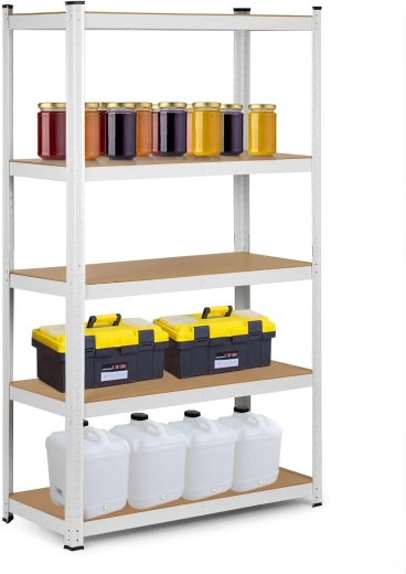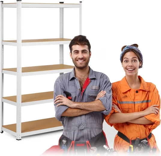 The universal metal shelving unit HUMBREG in white offers 5 sturdy MDF shelves, a total load capacity up to 625 kg, and tool-free snap-fit assembly. With adjustable shelf height, protective foot caps, and rounded edges, it’s ideal for the garage, cellar, archive, or workshop. It can also be split into two smaller racks or used as a workbench.