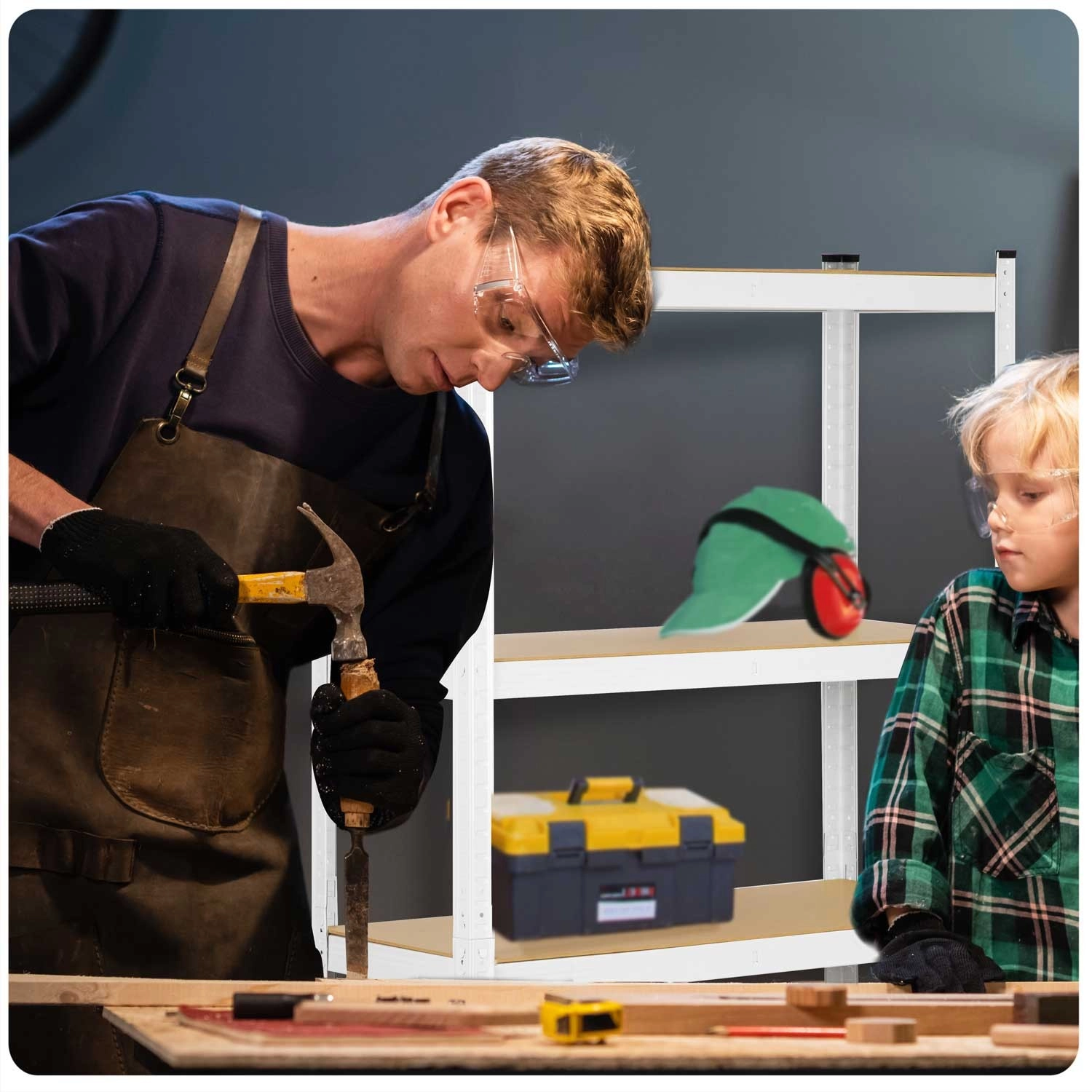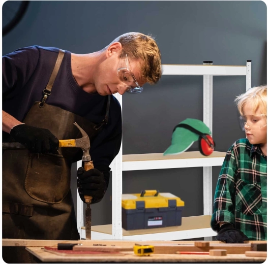 Assembly is quick and tool-free with a snap-fit system. Rounded edges improve safety in use, and plastic end caps protect floors from scratches and enhance stability. The rack can be flexibly reconfigured into two separate lower racks or used as a workbench for the workshop.