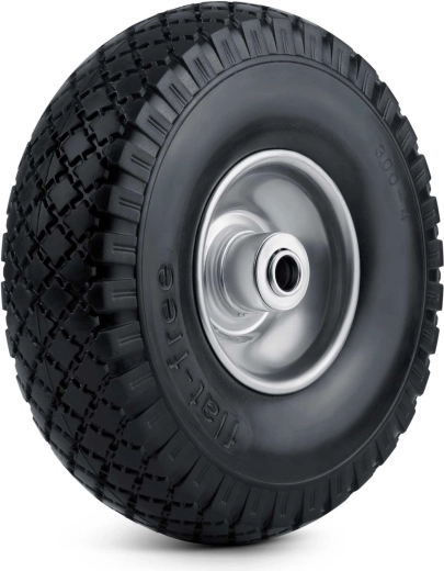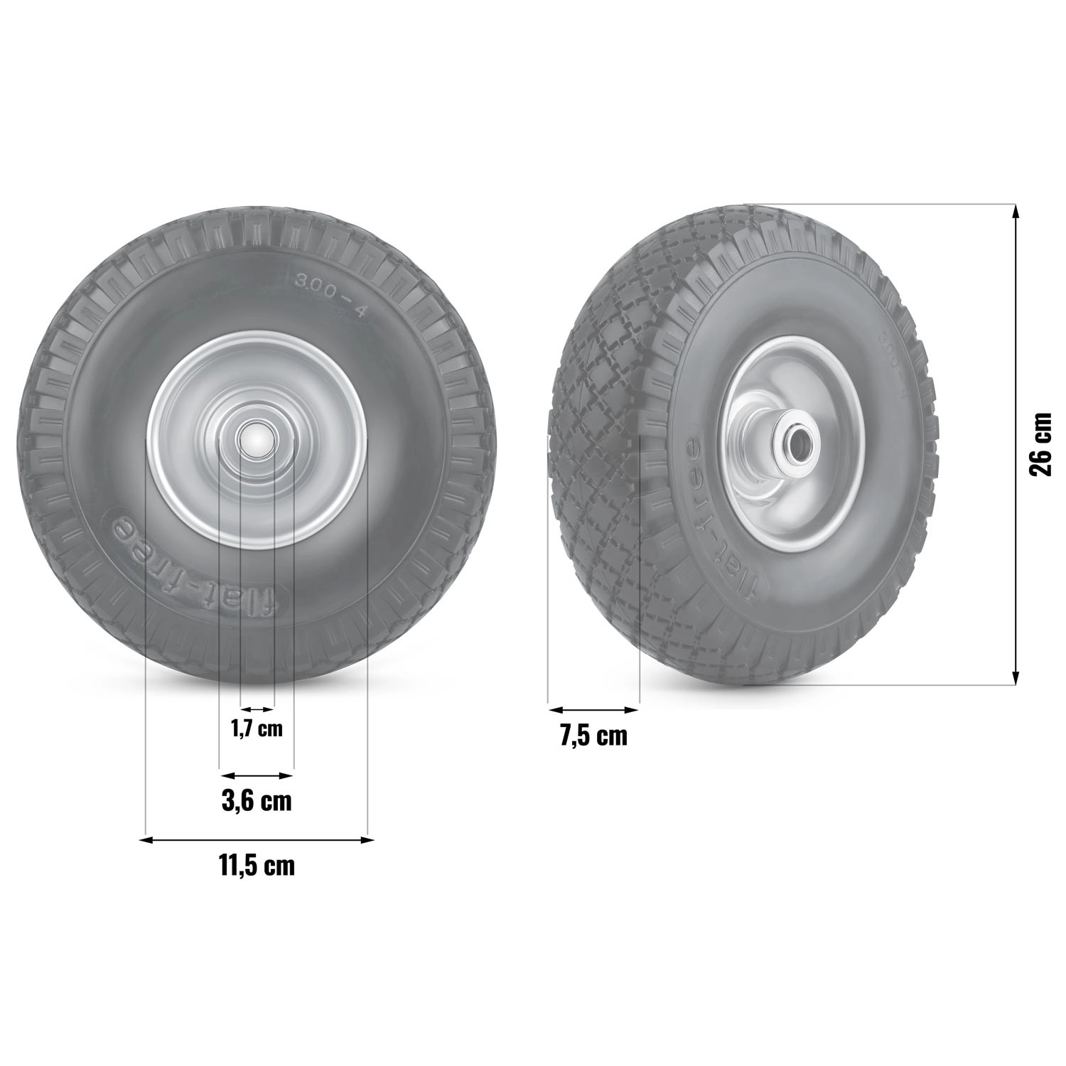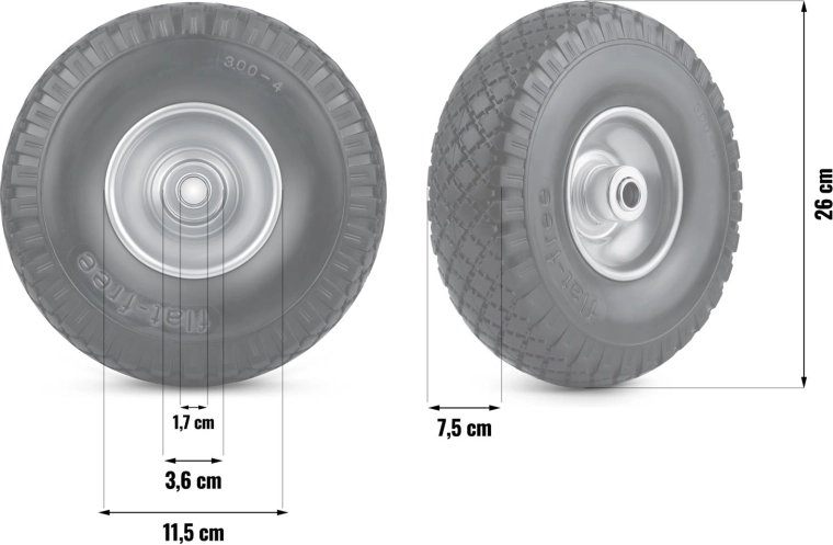 The universal HUMBERG 3.00-4 tubeless wheel is an ideal replacement for wheelbarrows and garden carts. It offers a durable reinforced steel rim, long-lasting ball bearings, and a PU foam core that won’t puncture and requires no inflation. With a diameter of 26 cm, a width of 7.5 cm, and a bearing bore of 1.7 cm, it delivers reliable performance in workshops, gardens, and industrial settings.