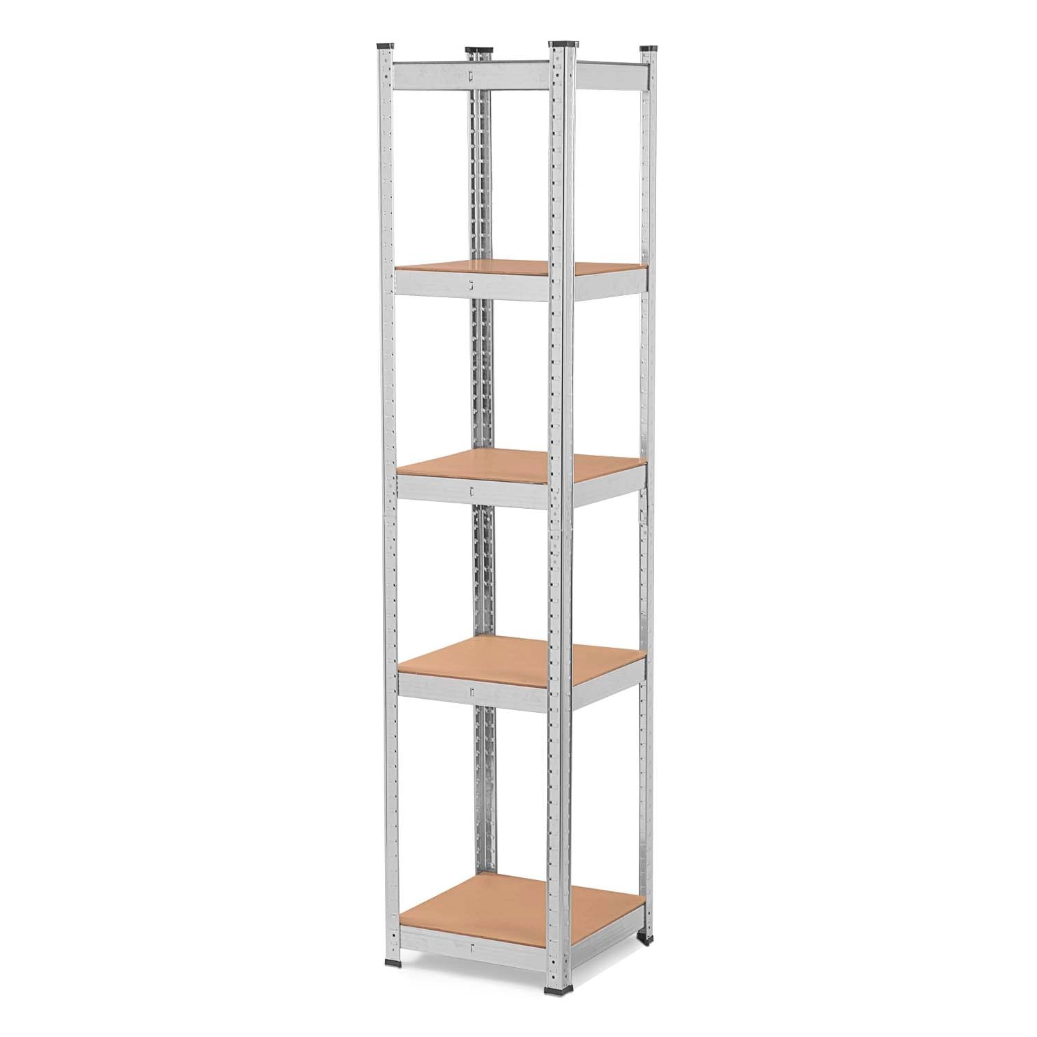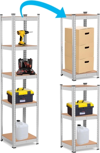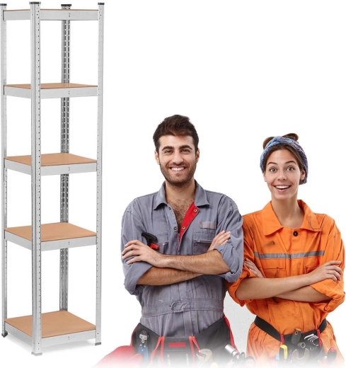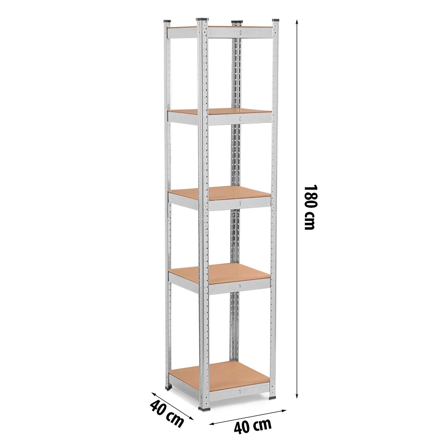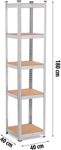 The universal and stable HUMBERG metal shelving unit measuring 180 × 40 × 40 cm offers 5 sturdy MDF shelves, adjustable shelf height in 40 mm steps, and a total load capacity up to 500 kg. Perfect for the garage, basement, archive, and workshop. Thanks to the screwless assembly system, it is quick to put together, rounded edges increase safety, and plastic end caps protect the floor.