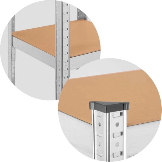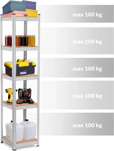 The robust HUMBERG shelving unit is ideal for neat and safe storage of tools, boxes, and supplies. Steel profiles and reinforcements beneath the MDF shelves ensure high stability and long life. Each shelf holds up to 100 kg, giving a total load capacity of 500 kg.