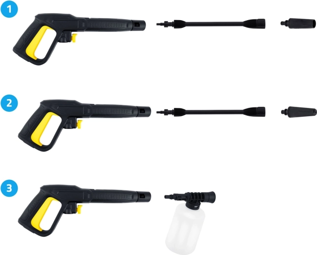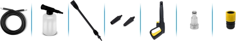 - Complete kit in the box: adjustable nozzle, turbo nozzle, 6 m hose, quick connector, 450 ml detergent bottle, cleaning pin, 5 m power cable.