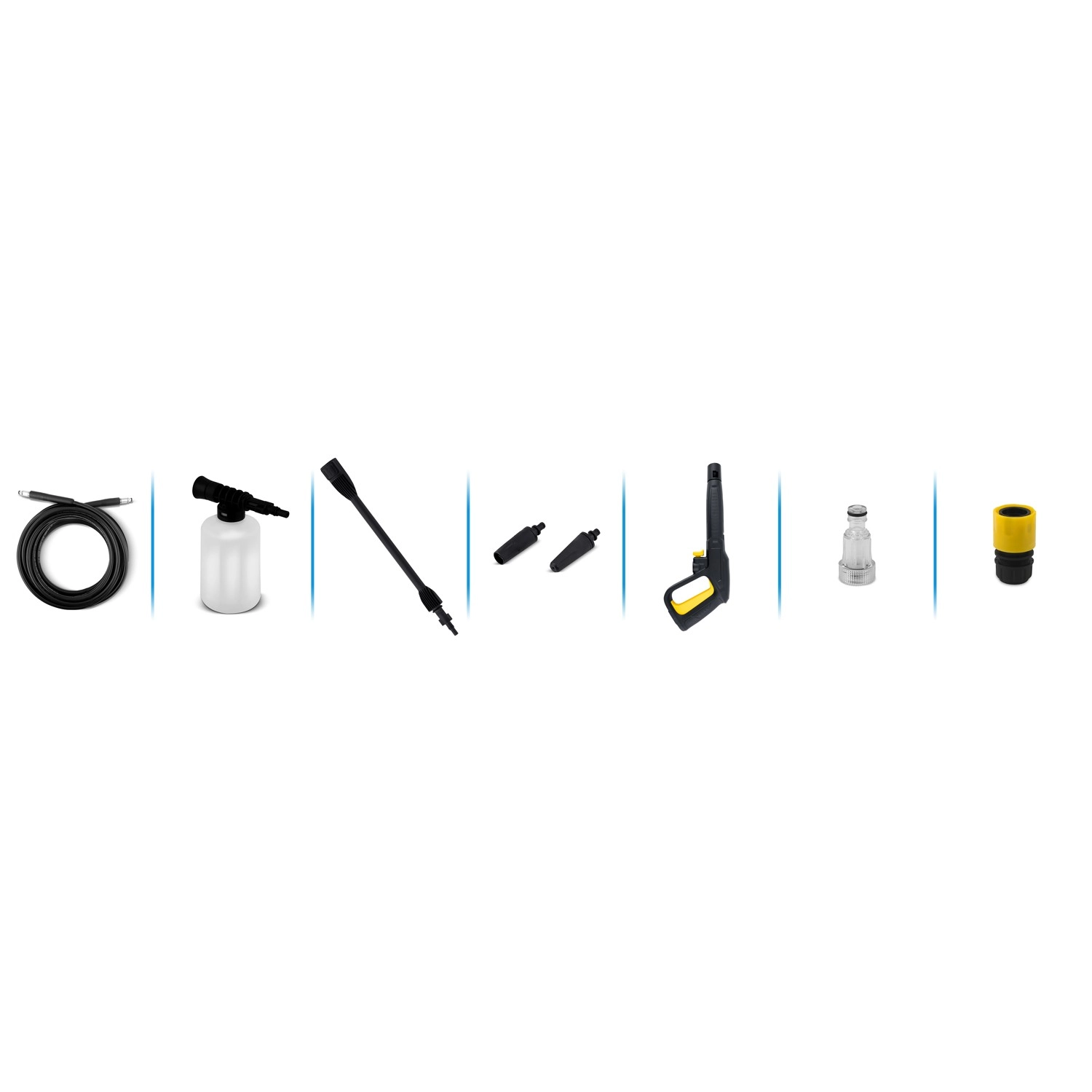 - adjustable nozzle, TurboStream™ turbo nozzle, 6 m high-pressure hose, quick connector and water connection, 450 ml detergent bottle with adjustment, cleaning pin, 5 m power cable, integrated water filter