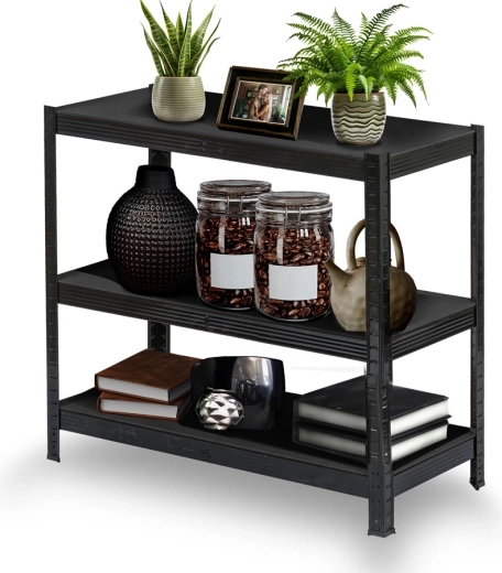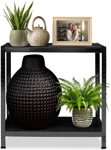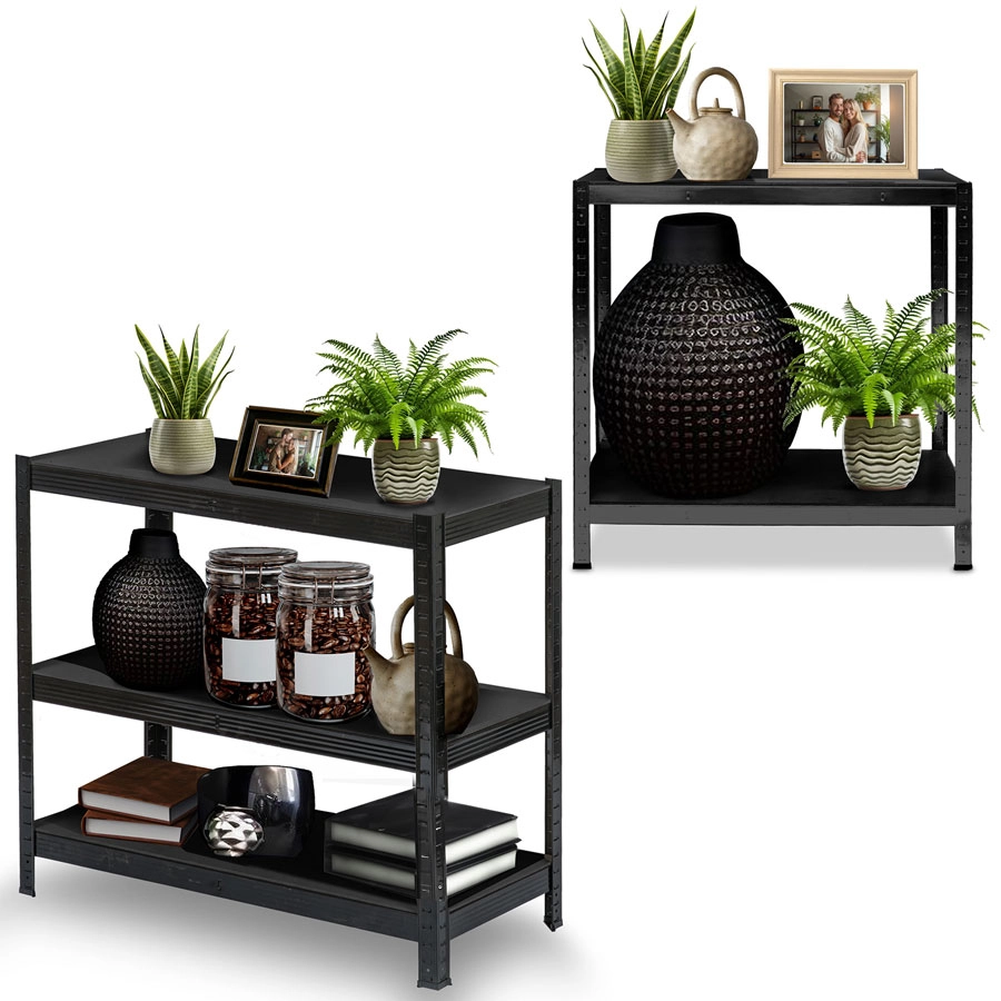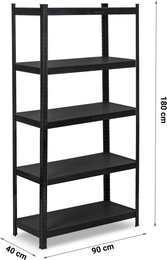Maximize your space with five generous shelves that are easy to adjust — height changes in 40 mm steps. The robust steel frame with galvanized profiles and double reinforcements beneath the shelves ensures stability even under heavy loads. The black powder-coated finish resists wear and fits perfectly in any interior or workshop.