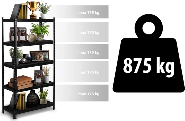 Each of the 5 shelves holds up to 175 kg with evenly distributed weight. Double central reinforcements increase rigidity and long-term stability when storing heavy items.